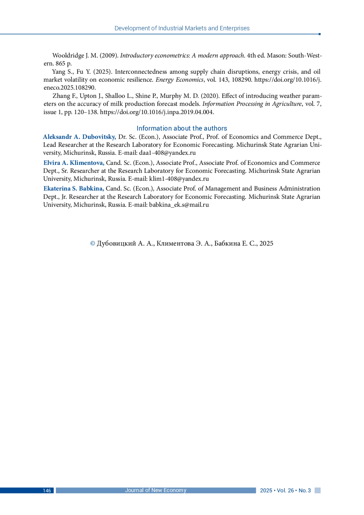 41. Yang S., Fu Y. (2025). Interconnectedness among supply chain disruptions, energy crisis, and oil market volatility on economic resilience. Energy Economics, vol. 143, 108290. DOI: 10.1016/j.eneco.2025.108290
