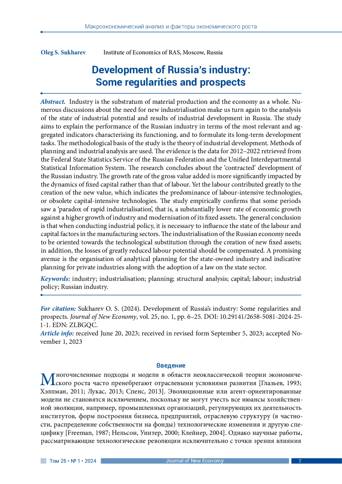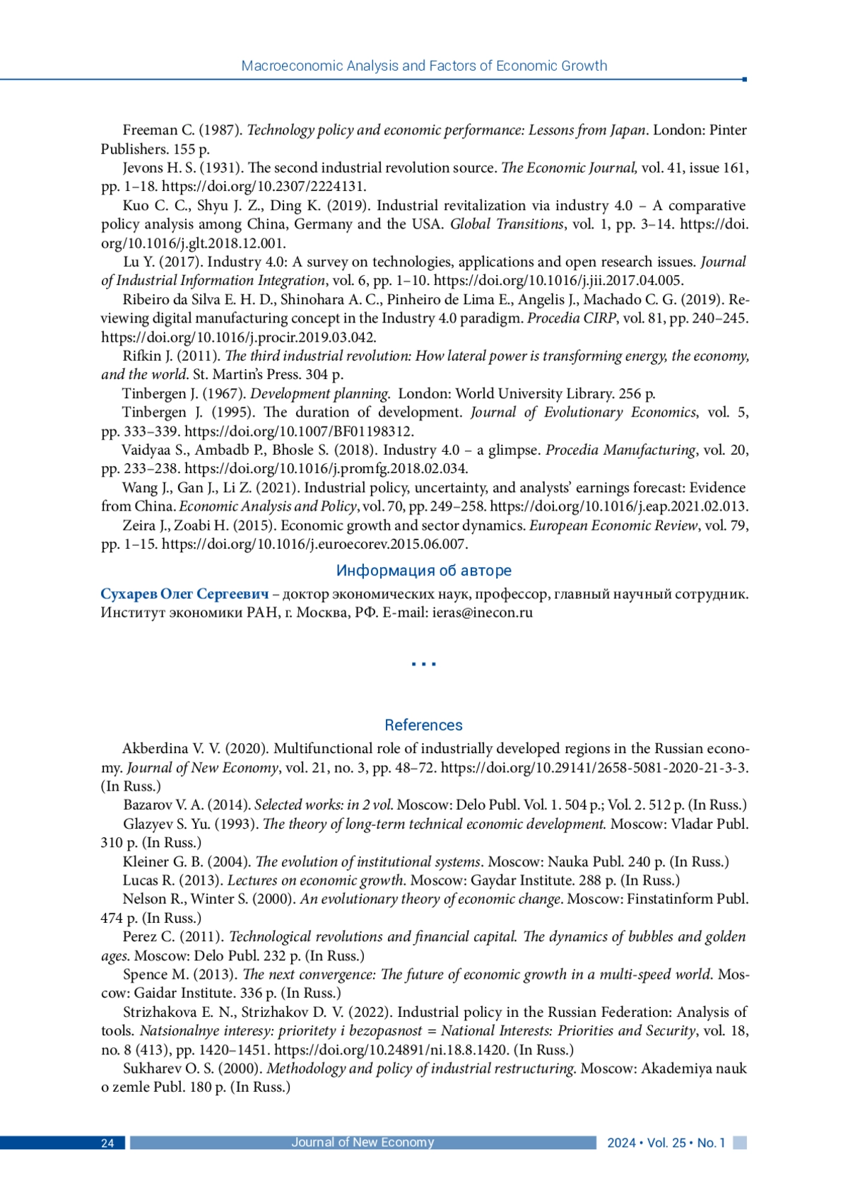 11. Сухарев О. С. (2022a). Промышленный рост и технологическая перспектива // Journal of New Economy. Т. 23, № 1. С. 6-23. DOI: 10.29141/2658-5081-2022-23-1-1 EDN: RNGFTG