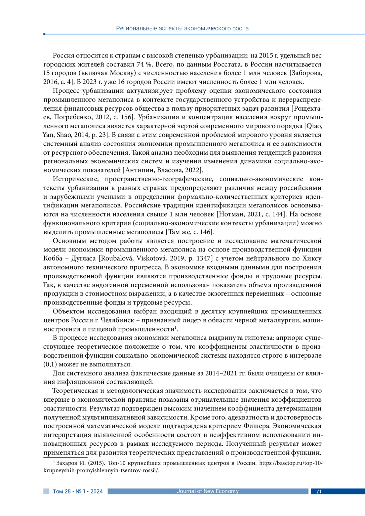 В условиях турбулентной внешней среды становится актуальным исследование экономического развития муниципальных образований. Статья посвящена разработке метода оценки факторов экономического развития промышленного мегаполиса на основе конструирования производственной функции. Методологическая база исследования основана на теоретических положениях макроэкономики и системного анализа. Основным методом работы является построение производственной функции Кобба – Дугласа с учетом автономного научно-технического прогресса, нейтрального по Хиксу. Информационной базой послужили данные Территориального органа Федеральной службы государственной статистики по Челябинской области по объему произведенной продукции (отгруженных товаров собственного производства, выполненных работ, услуг), стоимости основных производственных фондов и фонду оплаты труда в г. Челябинске за 2014–2021 гг., а также данные индекса-дефлятора цен. Модель формализована в виде программы для ЭВМ, имеет государственную регистрацию, что отражает ее практическую значимость. Теоретико-методологическое значение исследования состоит в том, что впервые в экономической практике показано, что отдельные коэффициенты эластичности могут принимать отрицательные значения. Полученные результаты могут быть использованы для прогнозирования влияния различных факторов на повышение экономической устойчивости промышленного мегаполиса