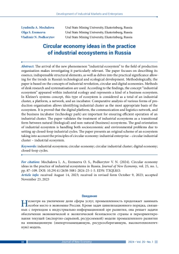 Возникновение нового феномена «промышленная экосистема» в сфере организации производства актуализирует необходимость его изучения. Статья посвящена описанию его сущности, обязательных структурных элементов, а также практической значимости с учетом тенденций технологического и экологического развития России. Методологической основой выступили концепции промышленной революции, циркулярной и цифровой экономики. Использовались методы кабинетного исследования и систематизации. Выявлено, что понятие «промышленная экосистема» возникло в рамках концепции промышленной экологии и рассматривается как разновидность экосистем бизнеса. Изучена системная концепция Г. Б. Клейнера, которая рассматривает данный тип экосистем как совокупность промышленного кластера, платформы, сети и инкубатора. Сравнительный анализ различных форм организации производства позволяет выделить промышленный кластер в качестве более подходящей основы экосистемы. Доказана важность цифровой платформы, коммуникационно-логистической сети и бизнес-инкубатора (технопарка) с точки зрения обеспечения эффективного функционирования промышленного кластера. Обосновано, что промышленные экосистемы могут рассматриваться в качестве промежуточной формы между природными (биологическими) и неприродными (бизнес-) экосистемами. Определена целевая ориентация промышленной экосистемы на решение одновременно социально-экономических и экологических проблем с помощью организации замкнутых промышленных циклов. Разработана схема экосистемы с учетом принципов циркулярной экономики: промышленное предприятие – циркулярный промышленный кластер – промышленная экосистема
