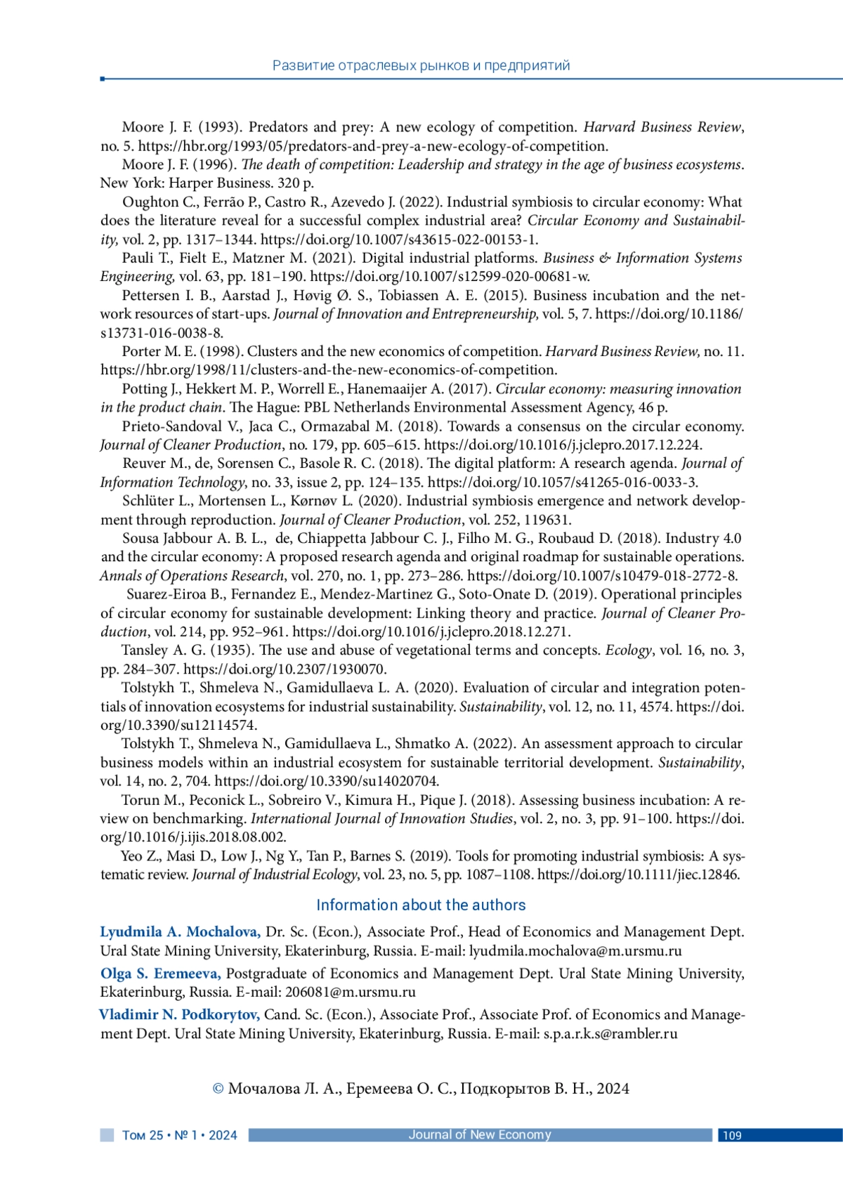 23. Преображенский Б. Г., Толстых Т. О., Шмелева Н. В. (2020). Промышленный симбиоз как инструмент циркулярной экономики // Регион: системы, экономика, управление. № 4 (51). С. 37-48. EDN: GPXUMW