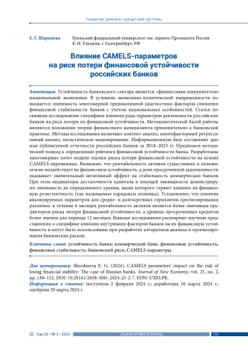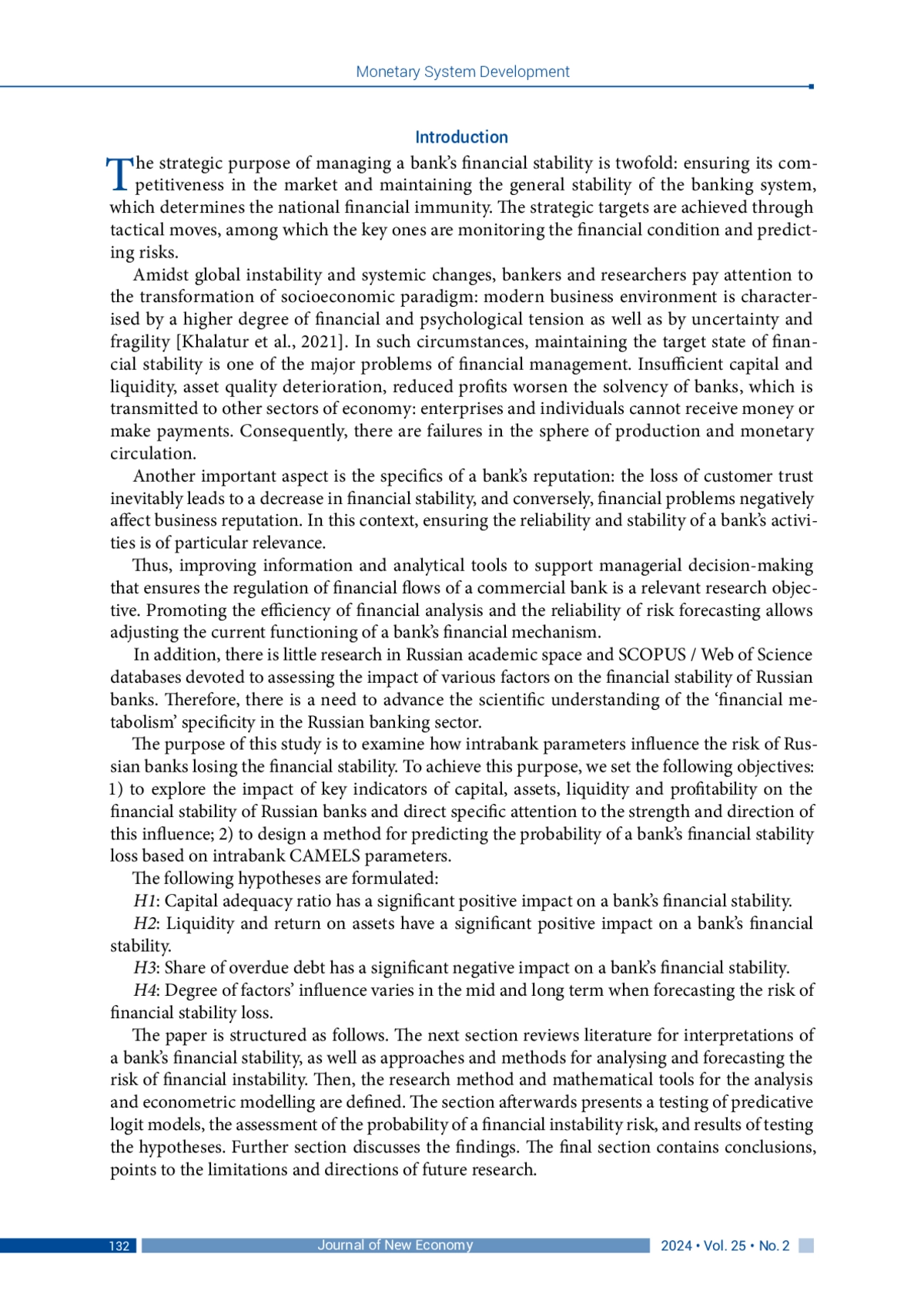 The banking sector stability determines the financial immunity of a national economy. Current economic and political tensions precondition the need for predicative diagnosis of factors behind a decrease in a bank’s financial stability taking into account national specificities. The paper aims to explore the impact of intrabank parameters on a risk of deteriorated financial stability of Russian banks. The methodological basis of the study is the theory of financial management as applied to the banking practice. The research methods include content analysis, multiple regression, and logit modelling. The evidence comes from the published financial statements of Russian banks for 2018–2023. The paper suggests an approach for rating banks according to their financial stability and develops logit models for evaluating the risk of losing financial stability based on the CAMELS parameters. The analysis demonstrates a noticeable positive impact of the return on assets and a noticeable negative effect of the overdue loans share on a bank’s financial stability. At the same time, capital adequacy and current liquidity produce an ambiguous effect on the financial strength: they are significant only up to a certain point, after passing which they no longer exert any impact on the financial stability (the so-called “surplus paradox”). The study finds that the impact of the parameters differs for the mediumand long-term forecasting horizons: for a 6-month period, the return on assets is a more significant predictor of the financial instability risk, while the overdue loans share is more important for a 12-month period. The findings extend the understanding of the influence that bank’s internal factors have on their financial stability and can be useful in building the algorithms for analysing and forecasting banking risks