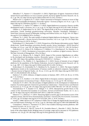 4. Беляева Ж. С., Лопаткова Я. А. (2023). Оценка уровня цифровизации и устойчивого развития в странах европейского региона // Экономика региона. Т. 19, № 1. С. 1-14. DOI: 10.17059/ekon.reg.2023-1-1 EDN: RODOYV