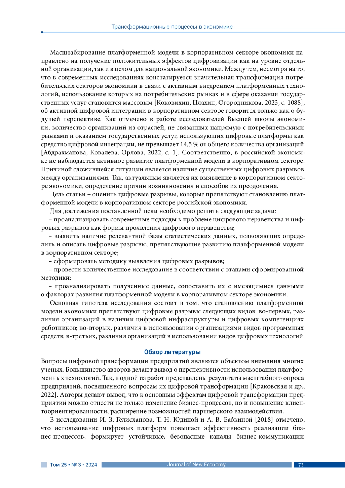 Существование цифровых разрывов значительно тормозит развитие платформенной модели в корпоративном секторе российской экономики, что не способствует активному проявлению положительных эффектов цифровизации. Недостаток методических и эмпирических работ, описывающих цифровые разрывы в корпоративном секторе экономики, не позволяет сформировать эффективные способы решения данной проблемы. Статья посвящена оценке цифровых разрывов, препятствующих становлению платформенной модели в корпоративном секторе национальной экономики. Методологическая база основывается на теории инноваций, концепции технологических укладов и концепции четвертой промышленной революции, которые обосновывают преимущества цифровизации и объясняют экономический рост с позиций технологического прогресса. Использован корреляционный анализ показателей, отражающих интенсивность применения организациями платформенных технологий и ряда других факторов. Информационную базу исследования составили данные НИУ ВШЭ об использовании в организациях программных средств и цифровых технологий за 2012–2022 гг. Результаты исследования показывают, что наибольшее значение для становления платформенной модели в корпоративном секторе экономики играет однородность цифровых технологий, используемых в отрасли. На втором месте по значимости стоит однородность в использовании программных средств, ориентированных на взаимодействие с партнерами, а также функционирование организаций в условиях доступа к широкополосному интернету. Полученные данные позволяют проводить диагностику становления платформенной модели путем описания цифровых и программных технологий, используемых потенциальными участниками цифровых платформ и бизнес-экосистем