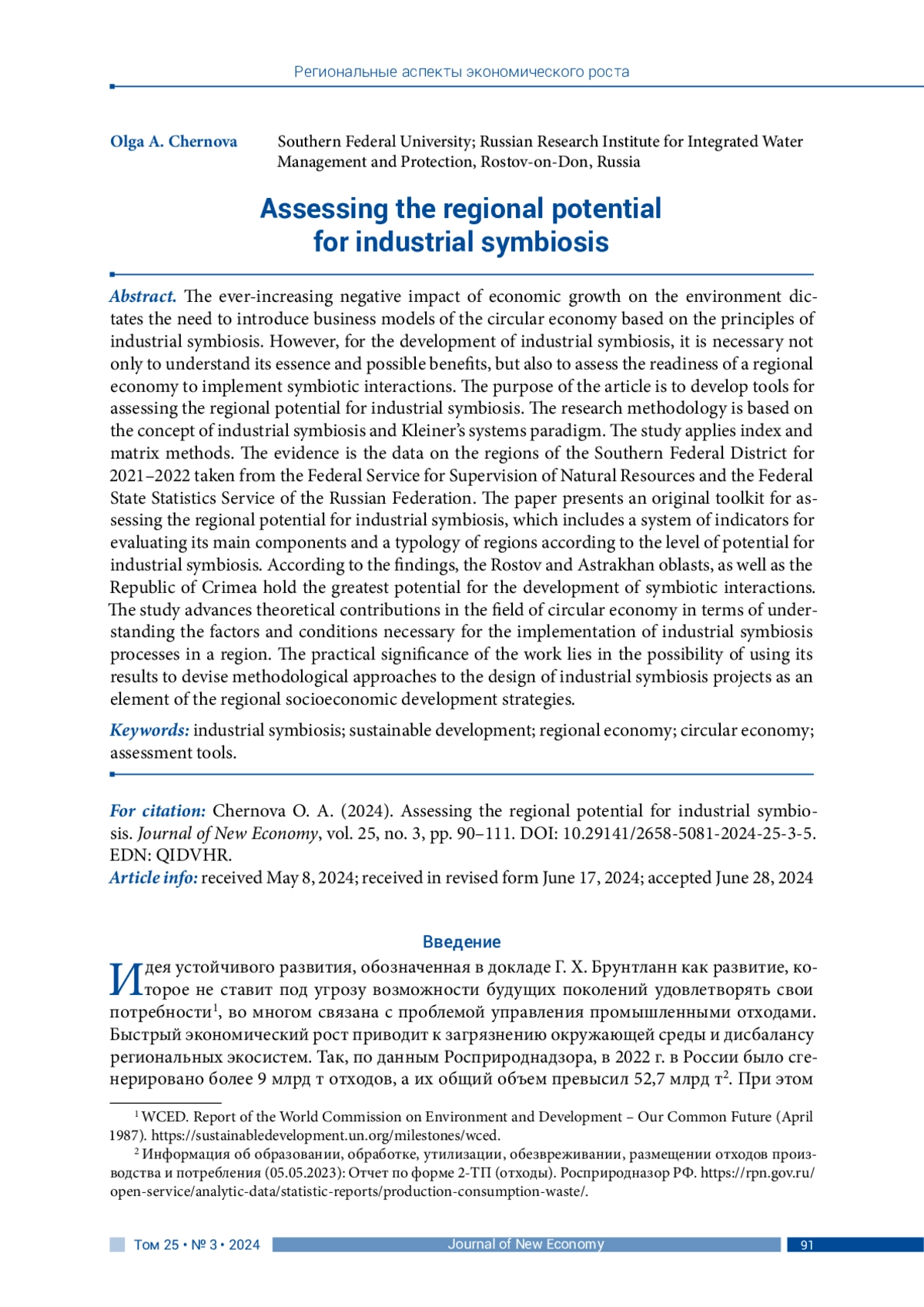 Постоянно возрастающее негативное воздействие экономического роста на окружающую среду обусловливает необходимость внедрения бизнес-моделей циркулярной экономики, базирующихся на принципах промышленного симбиоза. Однако для развития промышленного симбиоза необходимо не только понимание его сущности и возможных выгод, но и оценка потенциала региональной экономики к реализации симбиотических взаимодействий. Статья направлена на разработку инструментария оценки регионального потенциала промышленного симбиоза. Методология исследования базируется на концепции промышленного симбиоза и системной парадигме Г. Б. Клейнера. В исследовании использованы индексный и матричный методы. Информационную базу составили данные Росстата и Федеральной службы по надзору в сфере природопользования за 2021–2022 гг. по регионам ЮФО. В результате предложен инструментарий оценки регионального потенциала промышленного симбиоза, представляющий собой систему показателей оценивания его основных компонентов и типологизацию регионов по уровню развития потенциала промышленного симбиоза. Определено, что Ростовская и Астраханская области, а также Республика Крым обладают наибольшим потенциалом к развитию симбиотических взаимодействий. Исследование вносит вклад в развитие теоретических представлений в области циркулярной экономики с точки зрения понимания факторов и условий, необходимых для реализации процессов промышленного симбиоза в регионе. Практическая значимость работы выражается в возможности использования полученных результатов при формировании методических подходов к разработке проектов промышленного симбиоза как элемента стратегии социально-экономического развития российских регионов
