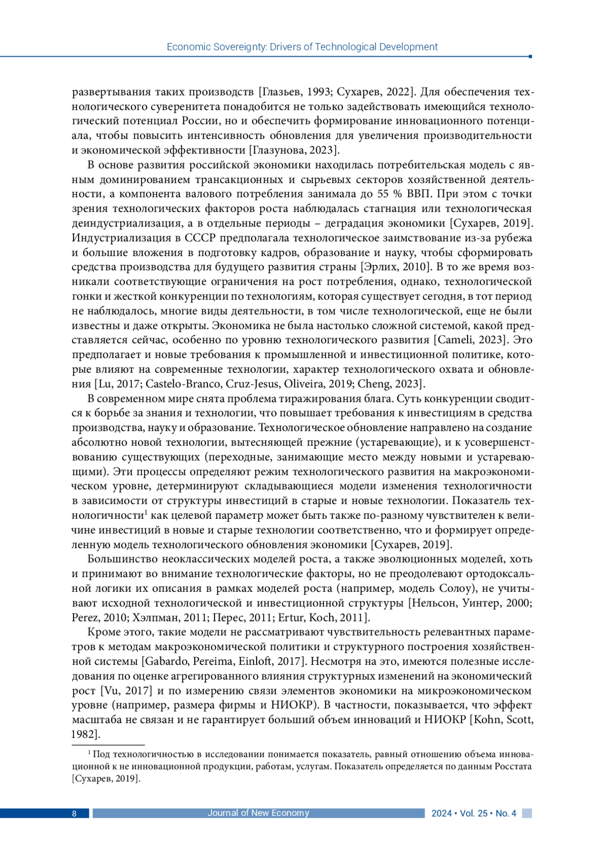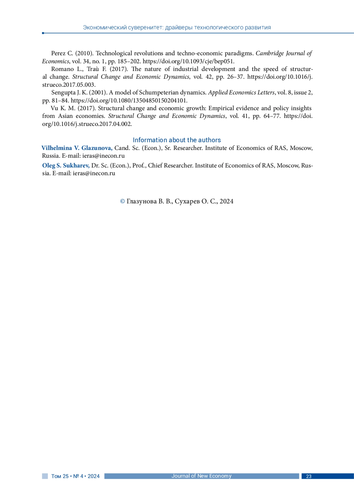 8. Сухарев О. С. (2022). Промышленный рост и технологическая перспектива // Journal of New Economy. Т. 23, № 1. С. 6-23. DOI: 10.29141/2658-5081-2022-23-1-1 EDN: RNGFTG