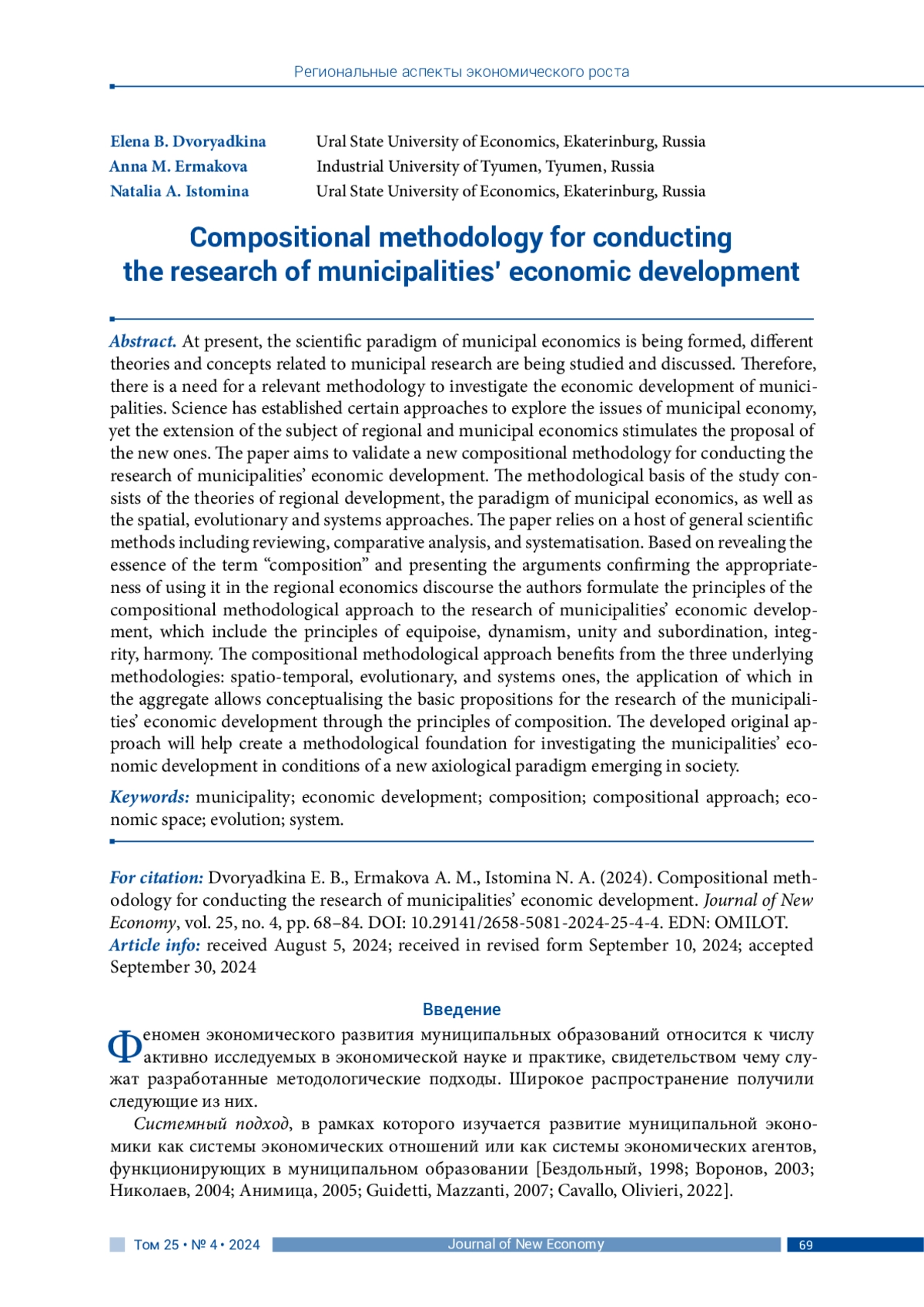 В настоящее время идет формирование научной парадигмы муниципальной экономики: происходит поиск и обсуждение различных теорий и концепций исследования муниципальных образований. В этой связи актуальной становится проблема разработки релевантного методологического инструментария исследования экономического развития муниципальных образований. В науке имеются устоявшиеся подходы к изучению вопросов муниципальной экономики и местного хозяйства, однако, расширение предметного поля региональной и муниципальной экономики требует предложения новых. Статья посвящена обоснованию нового методологического подхода к исследованию экономического развития муниципальных образований – композиционного. Методологической основой статьи послужили теории регионального развития, парадигма муниципальной экономики, а также пространственный, эволюционный и системный подходы. Использовался комплекс общенаучных методов, включая обзор, компаративный анализ и систематизацию. Раскрыта сущность понятия «композиция» и представлены аргументы, подтверждающие целесообразность его использования в дискурсе региональной экономики. Сформулированы принципы композиционного методологического подхода к исследованию экономического развития муниципальных образований: равновесия, динамизма, единства и соподчинения, целостности, гармонии. Композиционный методологический подход базируется на трех составляющих его методологиях: пространственно-временной, эволюционной и системной, применение которых в совокупности позволило через композиционные принципы концептуализировать основные положения исследования экономического развития муниципальных образований. Разработанный композиционный подход предоставит возможность сформировать методологическую основу исследования экономического развития муниципальных образований в условиях новой ценностной парадигмы