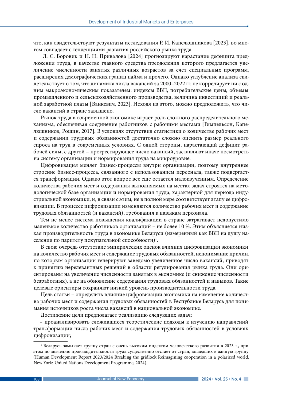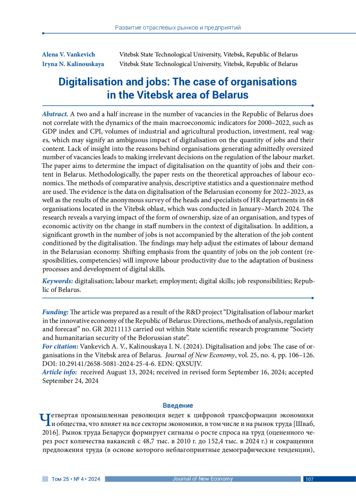 Рост числа вакансий более чем в 2,5 раза в Республике Беларусь не коррелирует с динамикой основных макроэкономических показателей за 2000–2022 гг., таких как индексы ВВП и потребительских цен, объемы промышленного и сельскохозяйственного производства, величина инвестиций и реальной заработной платы, что может указывать на неоднозначное влияние цифровизации на количество рабочих мест и содержание труда в стране. Непонимание причин, по которым организации генерируют заведомо увеличенное число вакансий, приводит к принятию нерелевантных решений по вопросам регулирования рынка труда. Статья посвящена определению влияния цифровизации на количество рабочих мест и содержание трудовых обязанностей в Республике Беларусь. Методологическую базу исследования сформировали теоретические подходы экономики труда. Использованы методы компаративного анализа, описательной статистики и анкетирования. Информационную базу составили данные по цифровизации экономики в Республике Беларусь за 2022–2023 гг., а также результаты анонимного опроса руководителей и специалистов департаментов управления человеческими ресурсами 68 организаций Витебской области, проведенного в январе – марте 2024 г. Выявлено различное влияние формы собственности, размера организации и видов экономической деятельности на изменение численности сотрудников в контексте цифровизации. При этом значительный рост числа рабочих мест не сопровождается изменением содержания трудовых обязанностей, обусловленных цифровизацией. Полученные результаты могут служить основанием для корректировки оценок величины спроса на труд в экономике Республики Беларусь. Смещение акцента с количества рабочих мест на их содержательную составляющую (задачи, требуемые навыки) будет способствовать повышению производительности труда через адаптацию бизнес-процессов и развитие цифровых компетенций