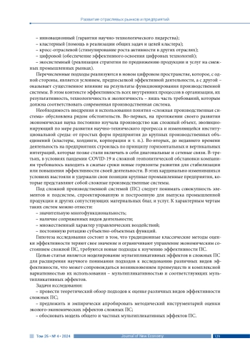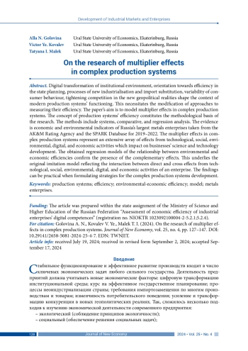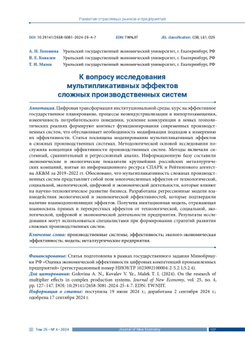 Цифровая трансформация институциональной среды, курс на эффективное государственное планирование, процессы неоиндустриализации и импортозамещения, изменчивость потребительского поведения, усиление конкуренции в новых геополитических реалиях формируют контекст функционирования современных производственных систем, что обуславливает необходимость модификации подходов к измерению их эффективности. Статья посвящена моделированию мультипликативных эффектов в сложных производственных системах. Методологической основой исследования послужила концепция эффективности производственных систем. Методы включали системный, сравнительный и регрессионный анализ. Информационную базу составили экономические и экологические показатели крупнейших российских металлургических компаний, взятые из информационного ресурса СПАРК и Рейтингового агентства AK&M за 2019–2022 гг. Обосновано, что мультипликативность сложных производственных систем представляет собой поле многочисленных эффектов от технологической, социальной, экологической, цифровой и экономической деятельности, которые влияют на научно-технологическое развитие бизнеса. Разработаны регрессионные модели взаимодействия экологической и экономической эффективностей, которые подтвердили наличие взаимодополняющих эффектов. Получена имитационная модель, отражающая взаимосвязь прямых и перекрестных эффектов от технологической, социальной, экологической, цифровой и экономической деятельности предприятия. Результаты исследования могут использоваться специалистами при формировании стратегий развития сложных производственных систем