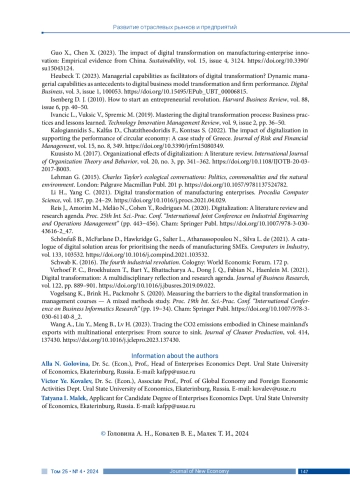 27. Guo X., Chen X. (2023). The impact of digital transformation on manufacturing-enterprise innovation: Empirical evidence from China. Sustainability, vol. 15, issue 4, 3124. DOI: 10.3390/su15043124 EDN: FPLZKQ