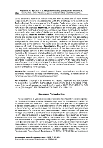 Результаты и дискуссия. Анализ и полемика в статье ведутся по следующим основным направлениям: понятийный аппарат, относящийся к фундаментальным, прикладным и поисковым научным исследованиям, и возможные направления его корректировки; проблемы финансирования исследований и разработок; необходимость и возможность диверсификации источников их финансирования.