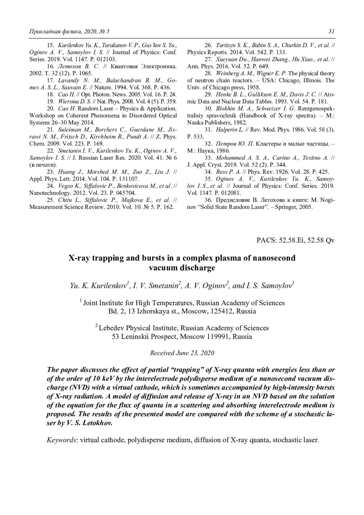 Куриленков Ю. К., Сметанин И. В., Огинов А. В., Самойлов И. С. Запирание и вспышки рентгеновского излучения в комплексной плазме наносекундного вакуумного разряда 23