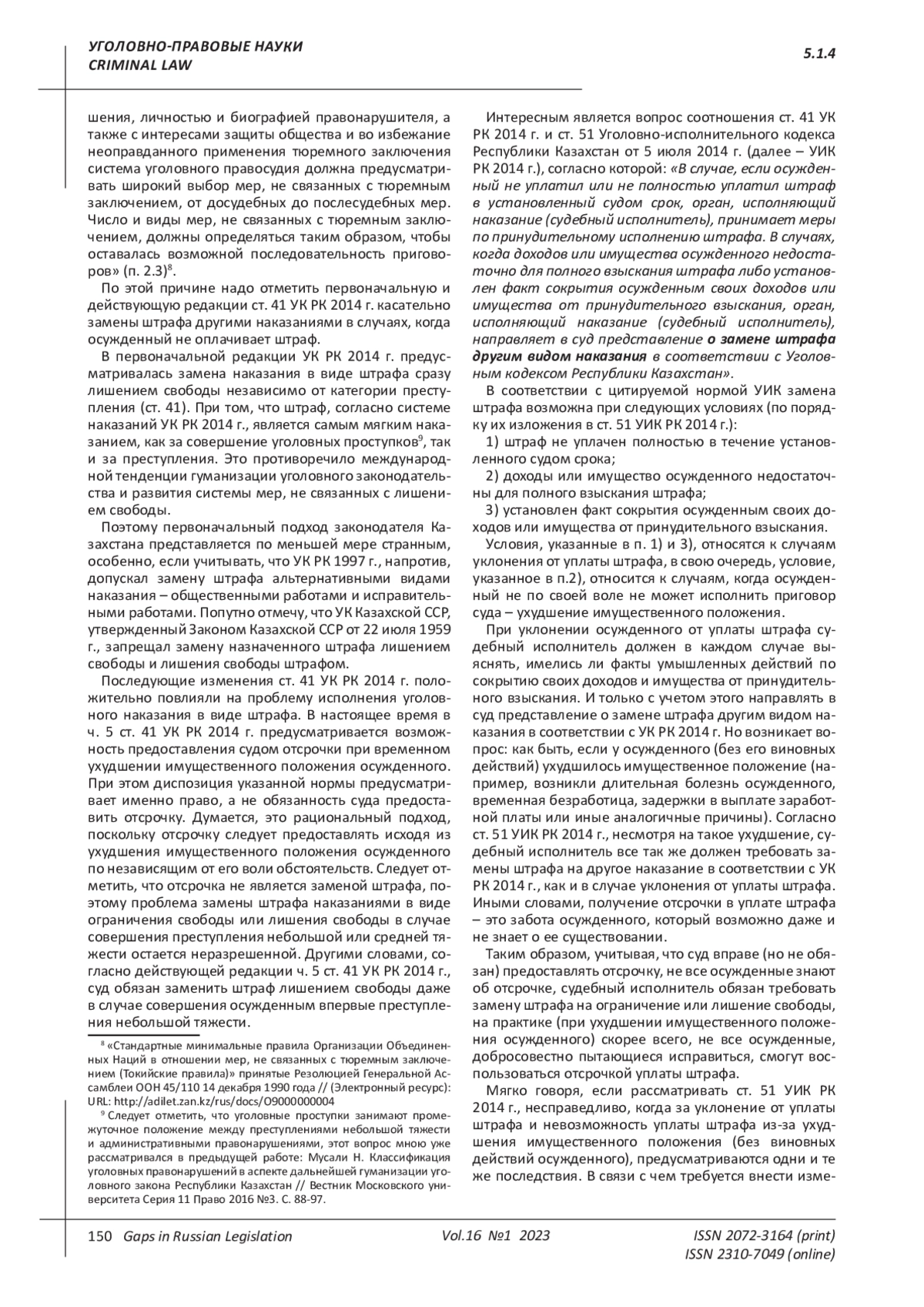 В УК РК 2014 г. предусмотрены высокие размеры штрафа, которые непосильны большинству осужденных. Согласно Закону Республики Казахстан от 2 декабря 2021 года № 77-VII ЗРК «О республиканском бюджете на 2022 – 2024 годы» месячный расчетный показатель (далее – МРП) для исчисления пособий и иных социальных выплат, а также применения штрафных санкций, налогов и других платежей в соответствии с законодательством Республики Казахстан устанавливается в размере 3 063 тенге (примерно 399 российских рублей или 6,5 долларов США)3. Так, в ст. 41 «Штраф» УК РК 2014 г. за преступления устанавливается штраф в пределах от 200 (612 600 тенге, примерно 79 870 российских рублей или 1 301 доллар США) до 10 000 МРП (30 630 000 тенге, примерно, 3 993 480 российских рублей или 65 087 долларов США) либо в кратном размере.