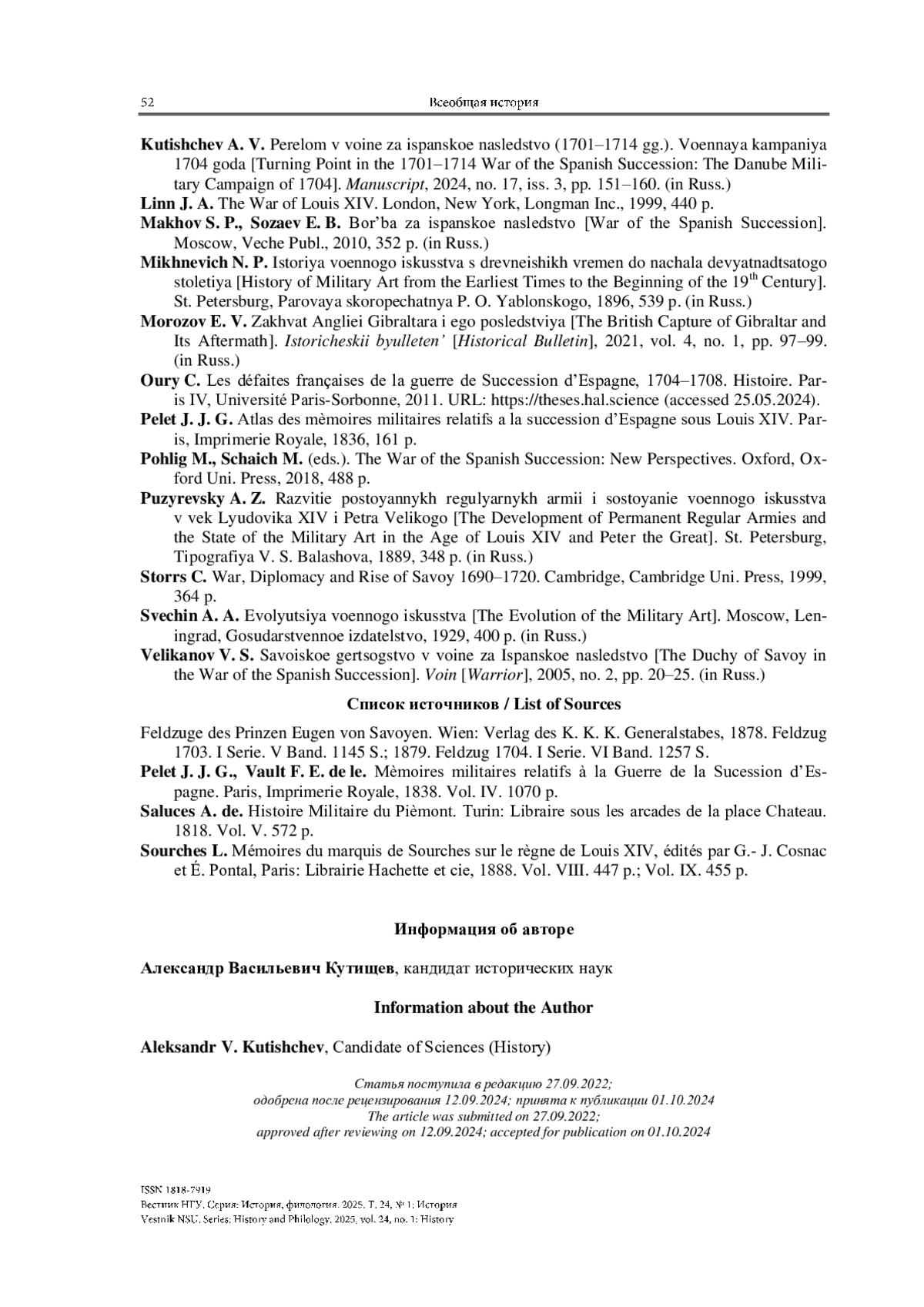 12. Кутищев А. В. Перелом в войне за испанское наследство (1701-1714 гг.). Военная кампания 1704 года // Манускрипт. 2024. № 17, вып. 3. С. 151-160.