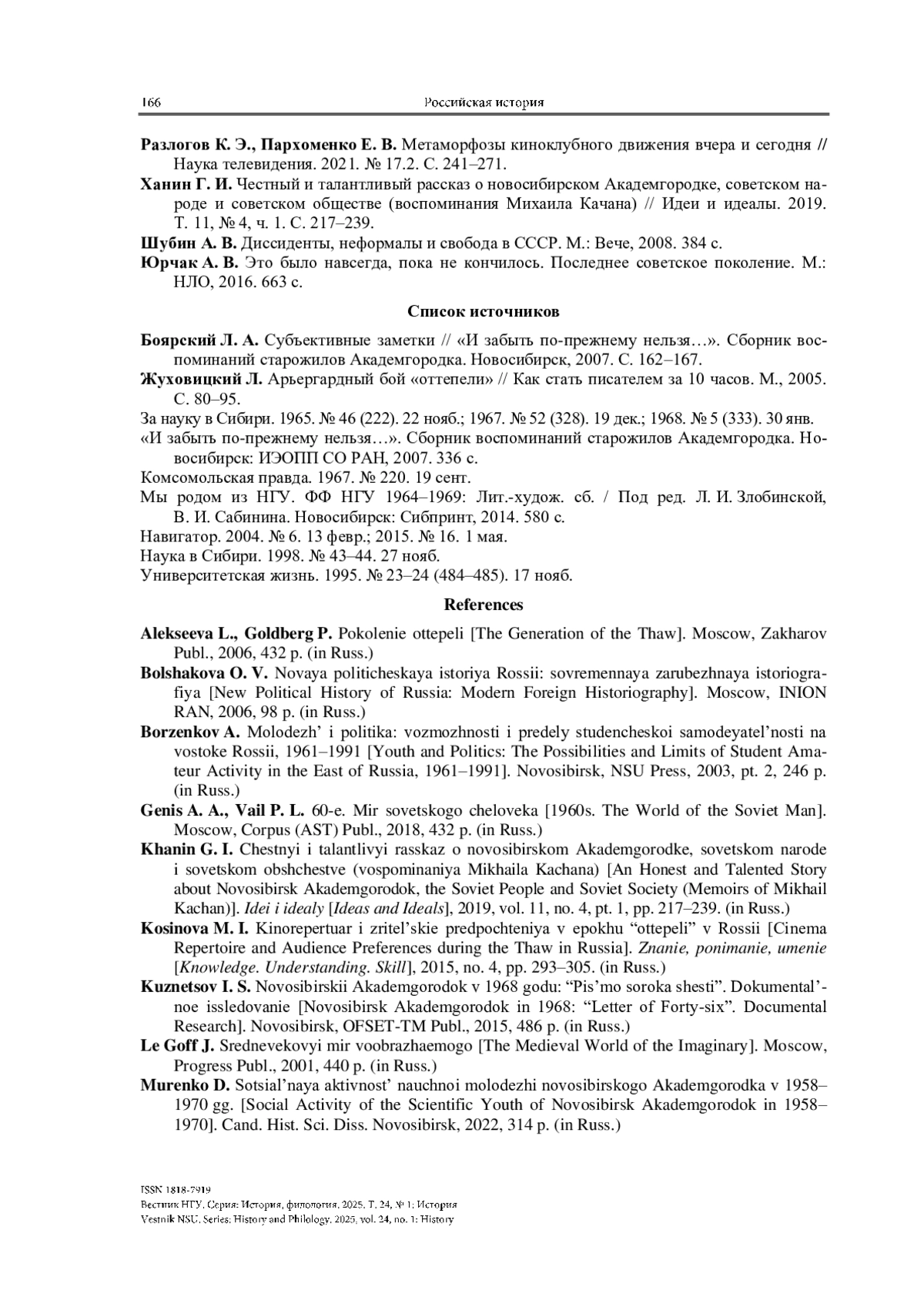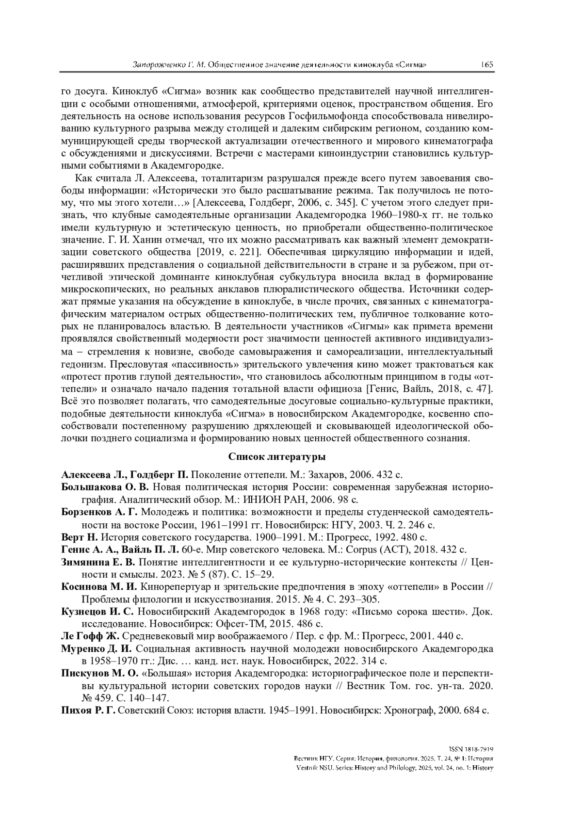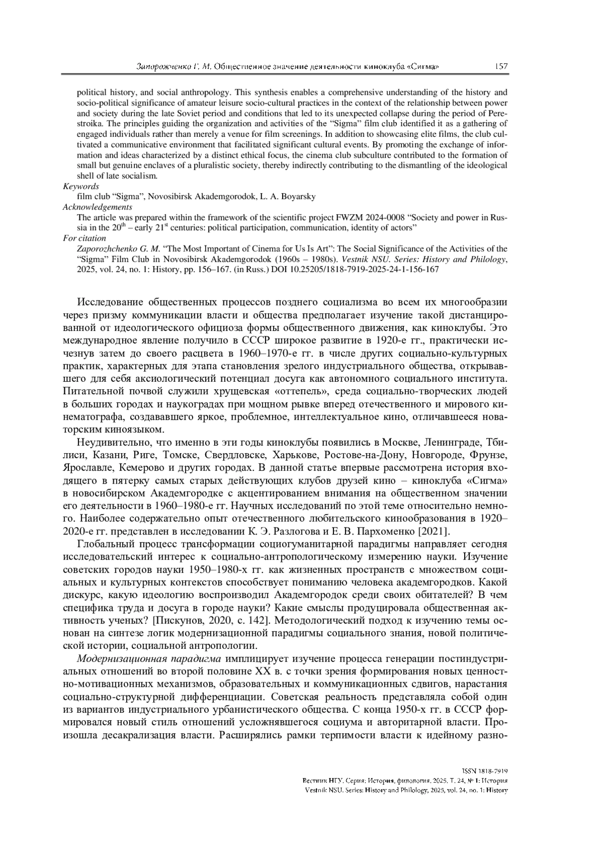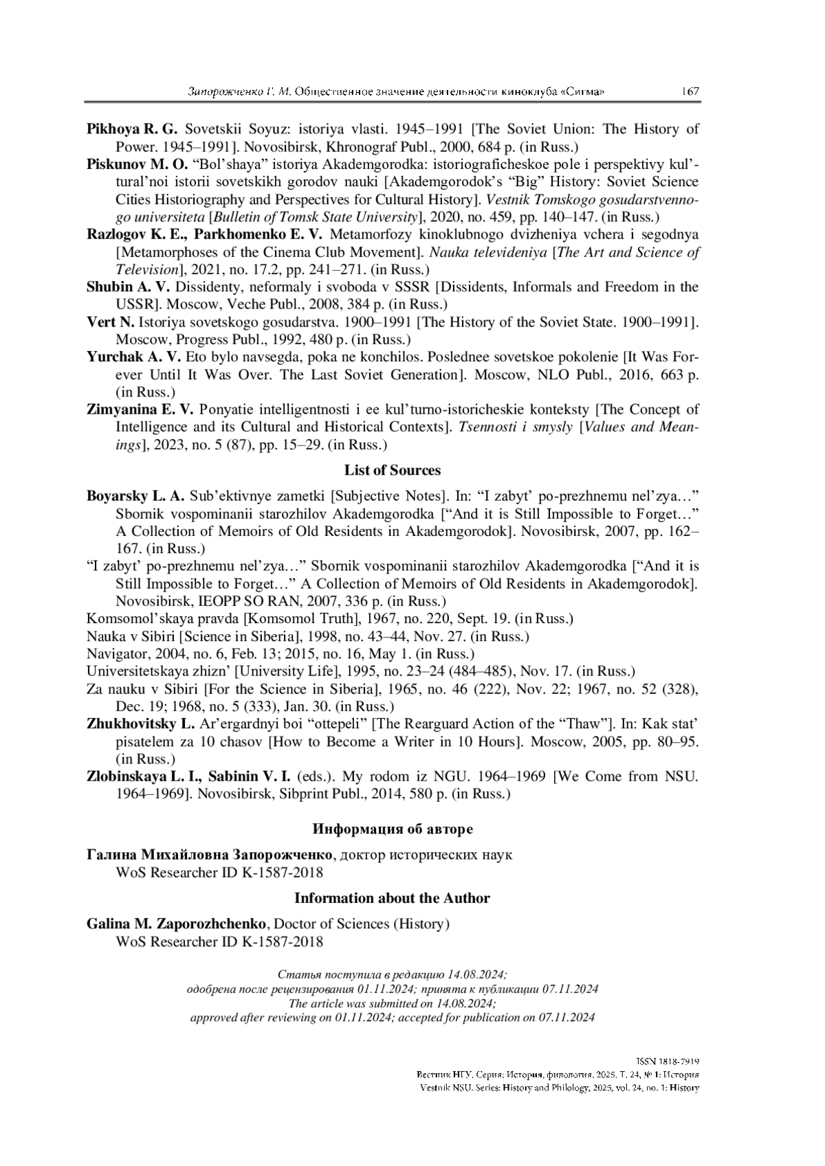 ЗАПОРОЖЧЕНКО Г. М. «ВАЖНЕЙШИМ ИЗ КИНО ДЛЯ НАС ЯВЛЯЕТСЯ ИСКУССТВО»: ОБЩЕСТВЕННОЕ ЗНАЧЕНИЕ ДЕЯТЕЛЬНОСТИ КИНОКЛУБА «СИГМА» В НОВОСИБИРСКОМ АКАДЕМГОРОДКЕ (1960–1980-Е ГОДЫ) // ВЕСТНИК НГУ. СЕРИЯ: ИСТОРИЯ, ФИЛОЛОГИЯ. 2025. ТОМ 24, № 1