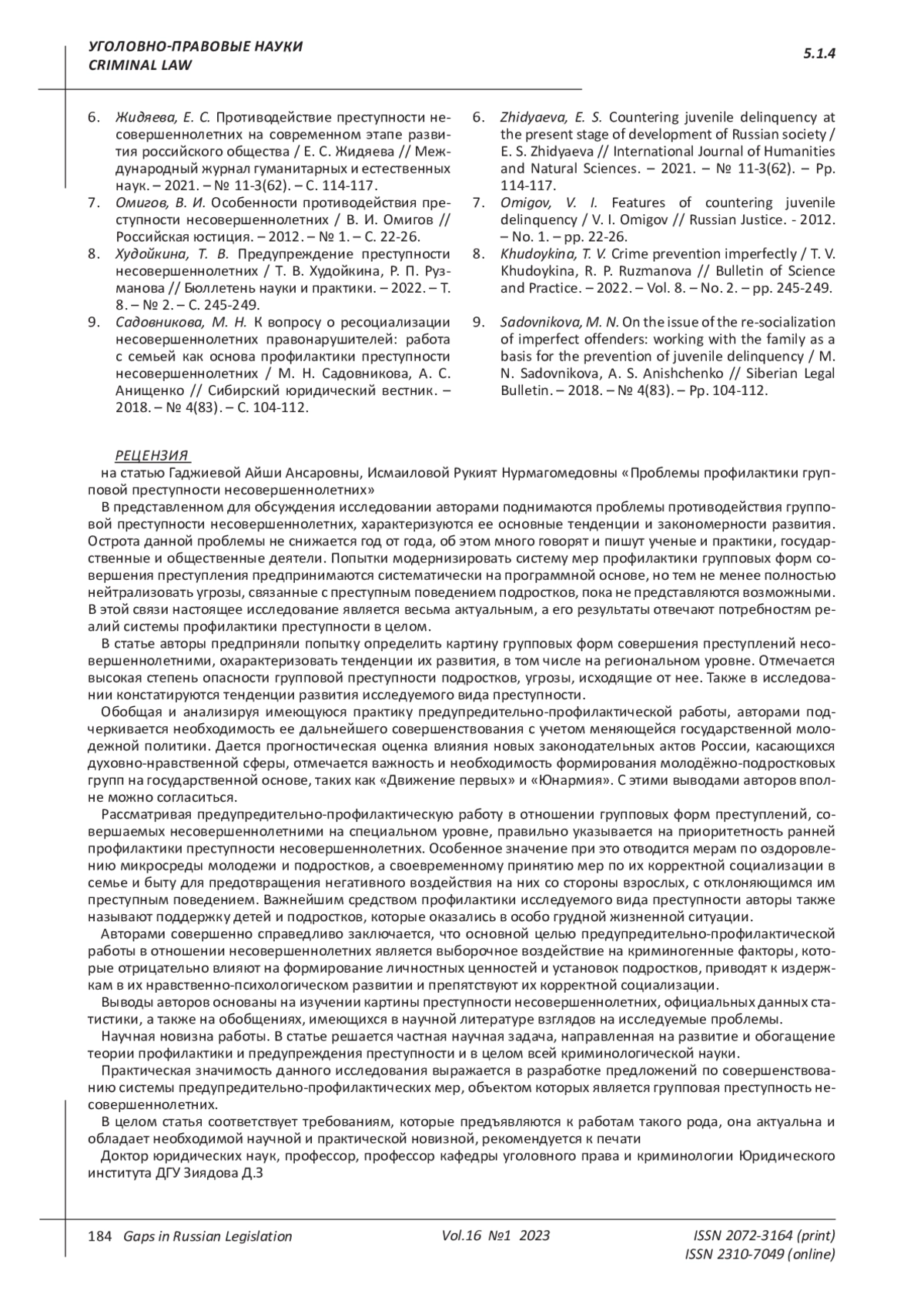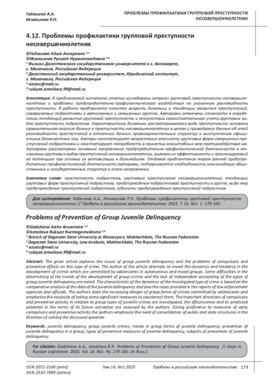 ГАДЖИЕВА А. А., ИСМАИЛОВА Р. Н. ПРОБЛЕМЫ ПРОФИЛАКТИКИ ГРУППОВОЙ ПРЕСТУПНОСТИ НЕСОВЕРШЕННОЛЕТНИХ // ПРОБЕЛЫ В РОССИЙСКОМ ЗАКОНОДАТЕЛЬСТВЕ. 2023. Т. 16 № 1