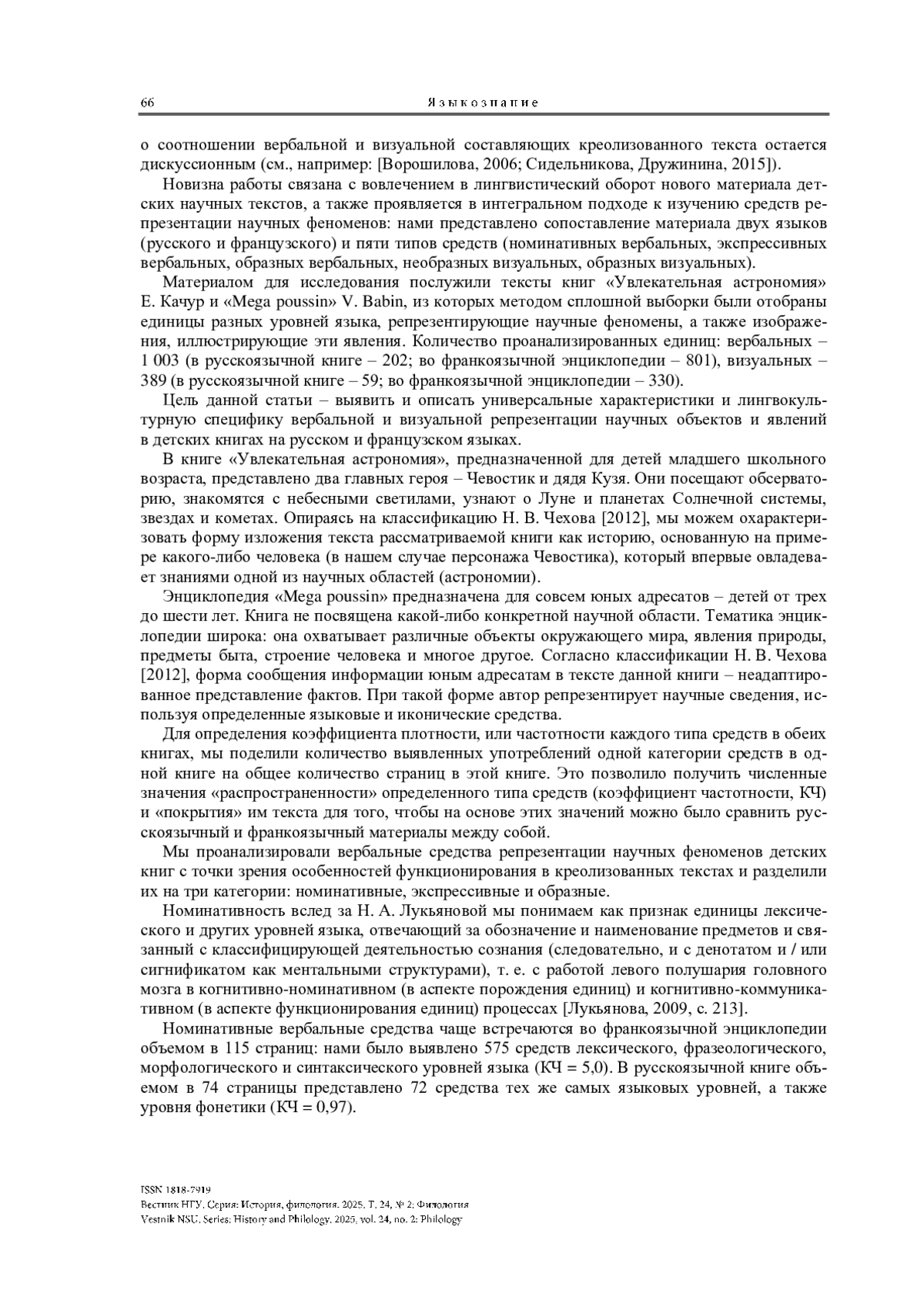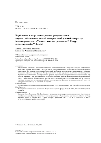 Представлены результаты лингвопрагматического анализа вербальных и визуальных средств репрезентации объектов и явлений, выявленных в детских книгах научно-популярного содержания на русском и французском языках. Все средства разделены на 5 категорий: вербальные номинативные, экспрессивные и образные, визуальные образные и необразные. Авторы используют их для упрощения восприятия материала детьми. Вербальные номинативные и экспрессивные средства характерны для франкоязычной энциклопедии, вербальные образные – для русскоязычной. Визуальные образные средства выявлены только в русскоязычной книге. Таким образом, франкоязычная детская энциклопедия создана по подобию взрослой, и адаптация к возрасту реципиентов проявляется в ней на уровне упрощенных формулировок; в русскоязычной книге создан художественный мир со сказочной атмосферой.
