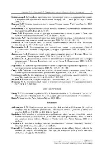 4. Ворошилова М. Б. Креолизованный текст: аспекты изучения // Политическая лингвистика. Екатеринбург, 2006. Вып. 20. С. 75-80.
