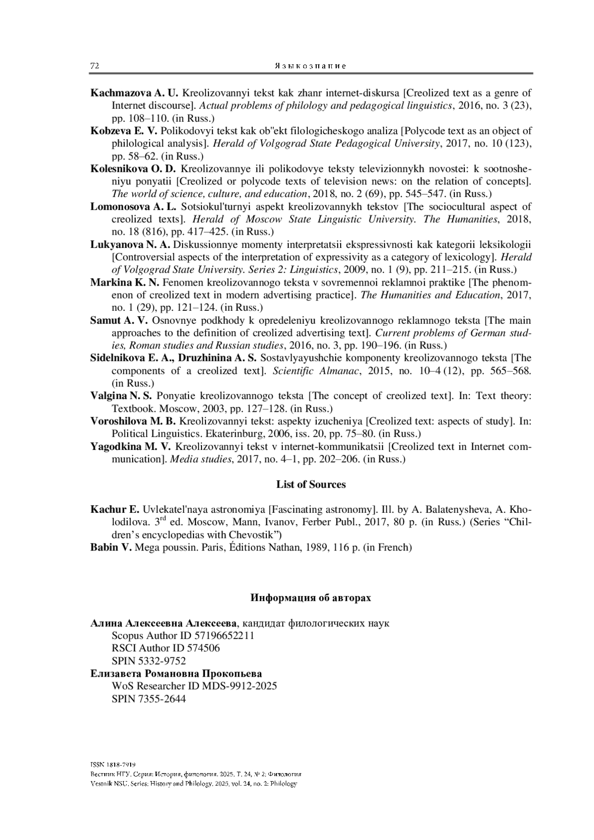 9. Ломоносова А. Л. Социокультурный аспект креолизованных текстов // Вестник Моск. гос. лингв. ун-та. Гуманитарные науки. 2018. № 18 (816). С. 417-425.