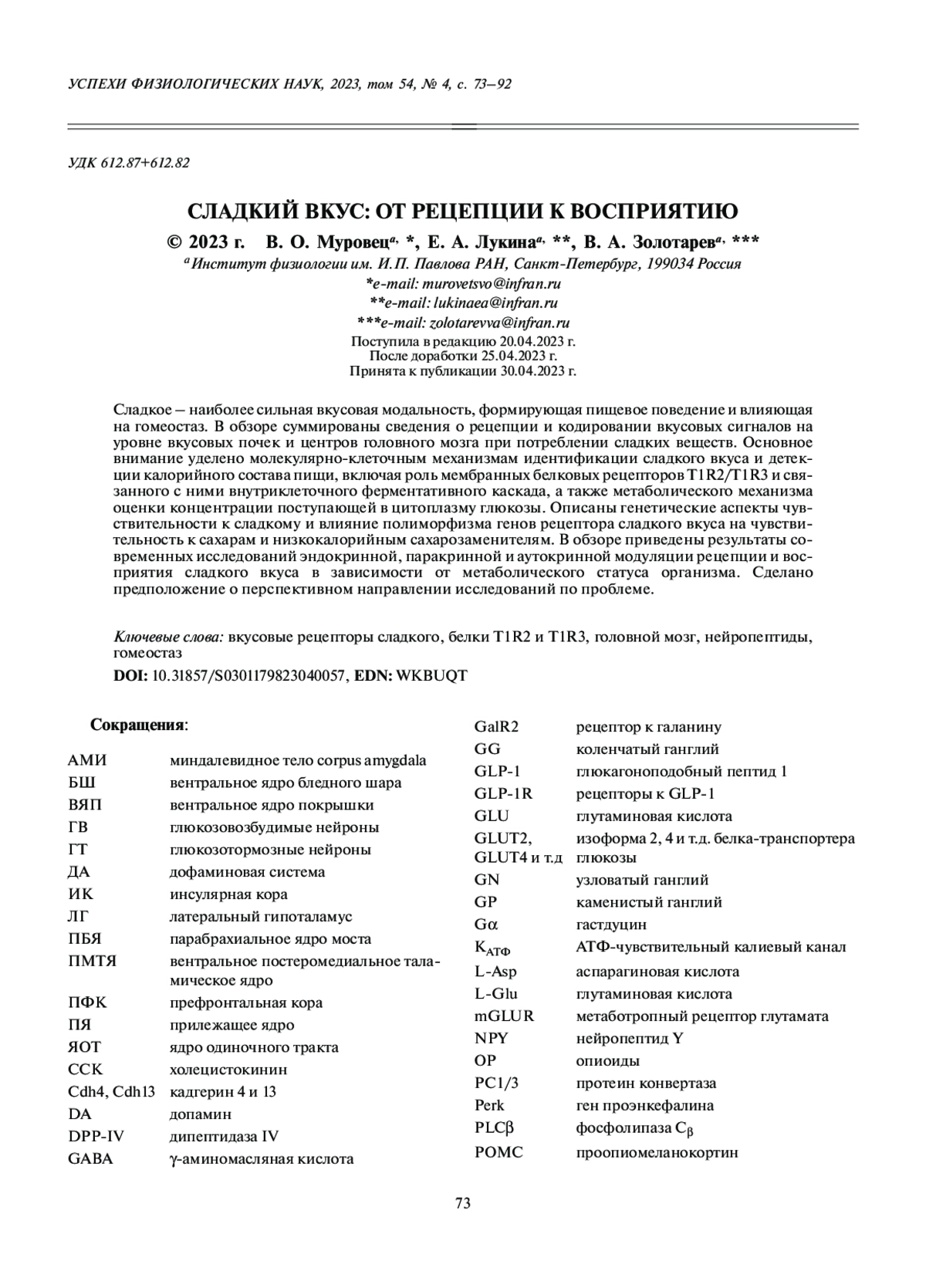 186. von Molitor E., Riedel K., Krohn M. et al. Sweet taste is complex: signaling cascades and circuits involved in sweet sensation // Front. Hum. Neurosci. 2021. V. 15. P. 667709. DOI: 10.3389/fnhum.2021.667709 EDN: QMXKCA