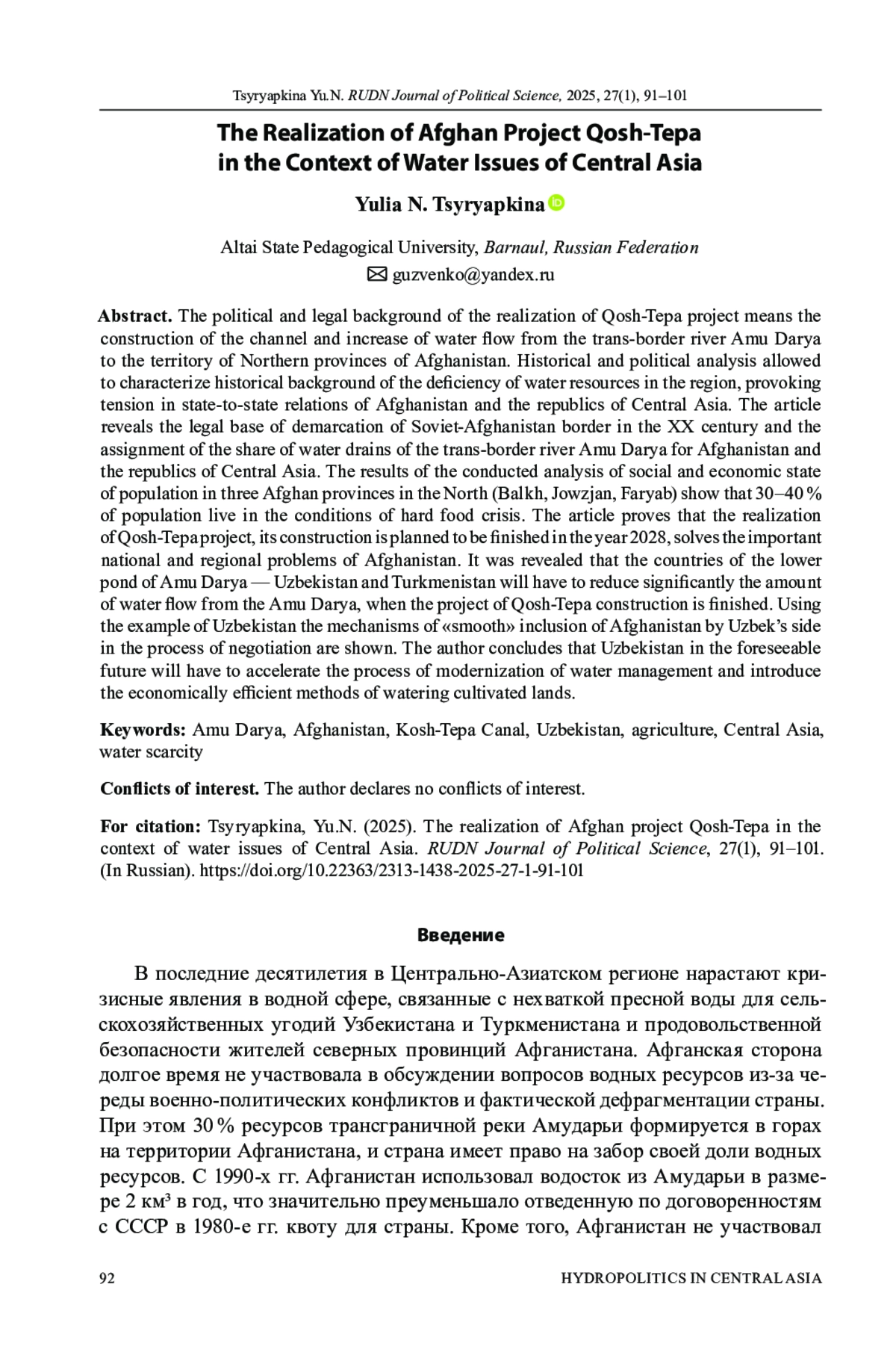 Политико-правовые основы реализации проекта Куш-Тепа подразумевают строительство канала и увеличение стока воды трансграничной реки Амударья на территорию северных провинций Афганистана. Историко-политологический анализ позволил охарактеризовать исторические предпосылки дефицита водных ресурсов в регионе, провоцирующий напряженность в межгосударственных отношениях Афганистана и центральноазиатских республик. Выявлена правовая база разграничения советско-афганской границы в XX в. и выделения доли водостоков трансграничной реки Амударья для Афганистана и центральноазиатских республик. В результате анализа социально-экономического положения населения трех афганских провинций на севере Балх, Джаузджан, Фарьяб было выявлено, что 30-40 % населения проживает в условиях тяжелого продовольственного кризиса. Доказано, что реализация проекта Куш-Тепа, завершение строительства которого планируется в 2028 г., для Афганистана решает важнейшие национальные и региональные задачи. Выявлено, что странам нижнего бассейна Амударьи - Узбекистану и Туркменистану придется существенно снижать объемы водостока из реки после завершения строительства канала Куш-Тепа. На примере Узбекистана показаны механизмы «мягкого» включения узбекской стороной Афганистана в переговорный процесс. Автором сделан вывод, что Узбекистану в обозримом будущем придется ускоренными темпами переходить к модернизации водного хозяйства и экономичным методам полива сельскохозяйственных угодий.