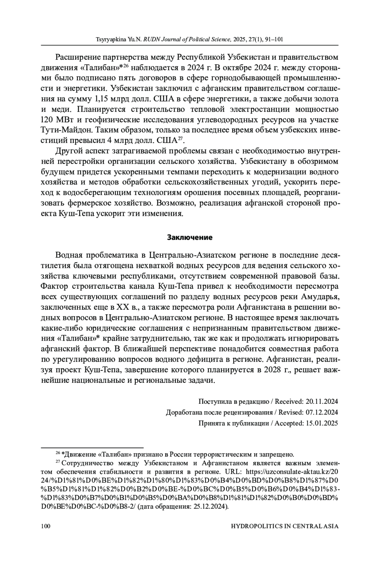 2. Жильцов С.С. Проблема дефицита водных ресурсов в Центральной Азии: фактор Афганистана // Проблемы постсоветского пространства. 2023. Т. 10. № 2. С. 110-119. ;. DOI: 10.24975/2313-8920-2023-10-2-110-119 EDN: OQTYBK