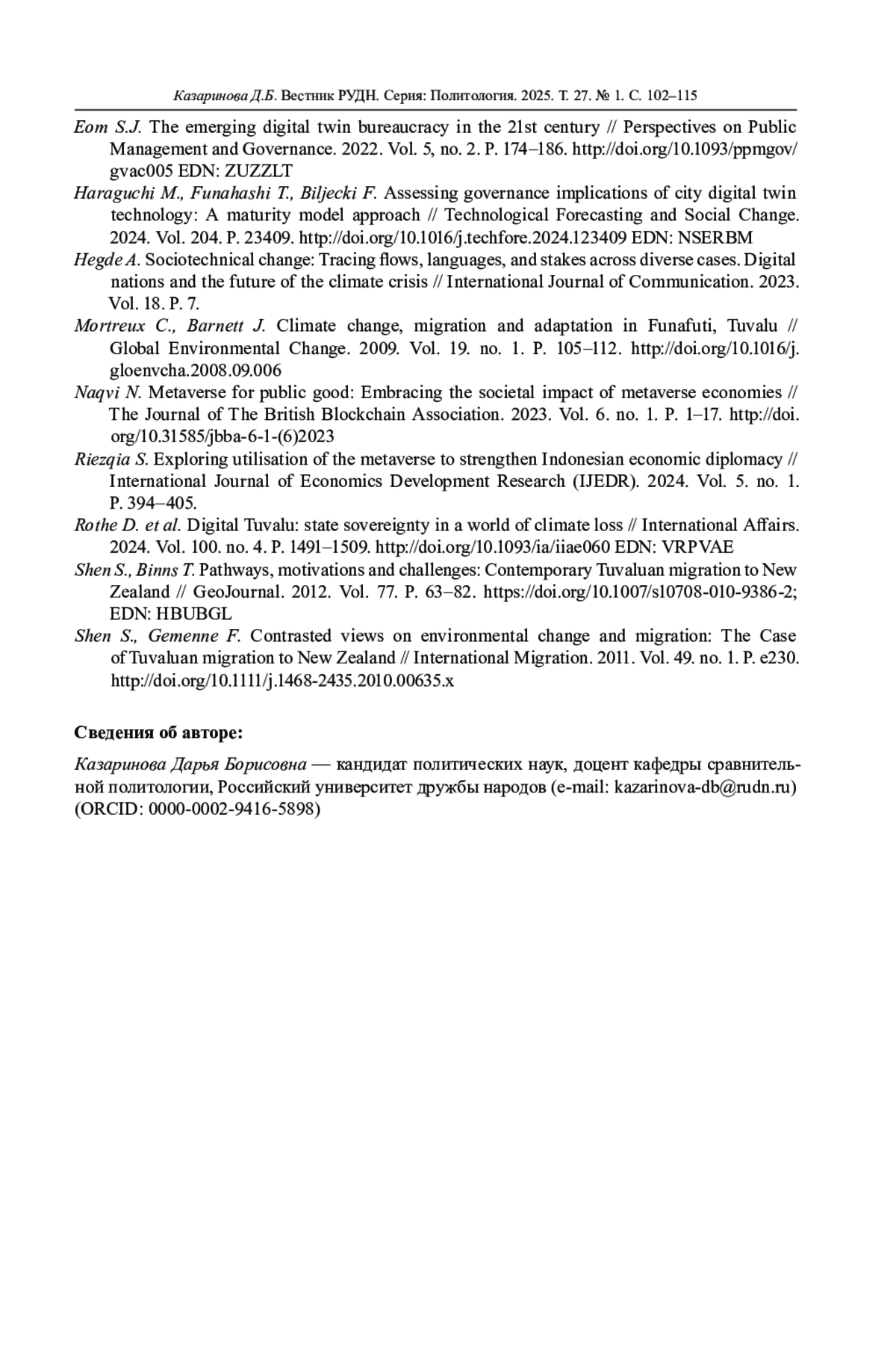 19. Rothe D. et al. Digital Tuvalu: state sovereignty in a world of climate loss // International Affairs. 2024. Vol. 100. no. 4. P. 1491-1509. DOI: 10.1093/ia/iiae060 EDN: VRPVAE