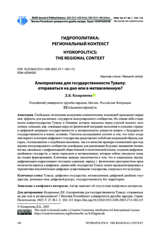 Глобальное потепление вследствие климатических изменений производит неравные эффекты для различных государств международного сообщества. На основе кейс-стади опыта микрогосударства Тувалу в Океании, которое оказалось перед угрозой полного затопления, показано, как, совмещая меры по физической миграции населения в соседние страны и цифровой миграции государственности в метавселенную, решается вопрос о будущности государственности в новых условиях. Гипотеза исследования состоит в том, что опыт создания первого в истории цифрового государства представляет собой как модельный образец для стран, столкнувшихся с подобными вызовами, так и в качестве примера становления при поддержке международного сообщества платформы для реализации будущих инициатив человечества, связанных с цифровизацией общественной и политической жизни, создания цифровых двойников государств, а также переходом в метавселенные, которые сейчас находятся лишь на стадии формирования. Ключевые выводы заключаются в том, что в социальных науках цифровизация подразумевает ситуацию удвоения: наряду с физическим пространством предполагается переход в цифровое, однако кейс государства Тувалу может продемонстрировать в перспективе исключительно цифровое существование государства, социума и его культуры.