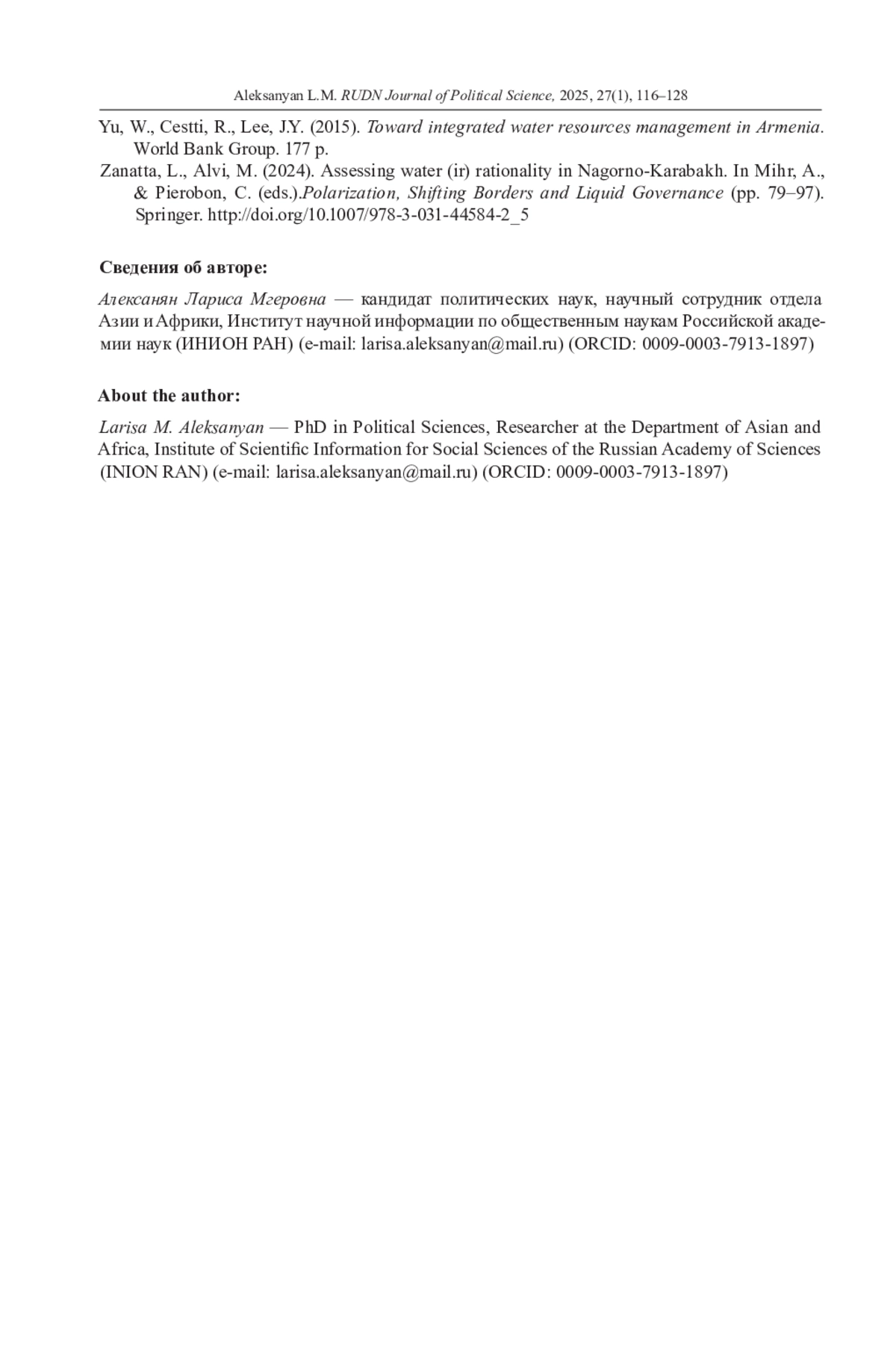 8. Zanatta, L., Alvi, M. (2024). Assessing water (ir) rationality in Nagorno-Karabakh. In Mihr, A., & Pierobon, C. (eds.).Polarization, Shifting Borders and Liquid Governance (pp. 79-97). Springer. DOI: 10.1007/978-3-031-44584-2_5