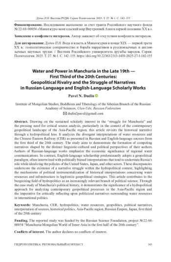 Актуальность обращения к теме «борьбы за Маньчжурию» в исторической ретроспективе обусловлена не только сохраняющимся научным интересом, но и острой необходимостью критического осмысления источников, освещающих данный период, особенно в контексте современной геополитической ситуации в Азиатско-Тихоокеанском регионе. Предметом настоящего исследования выступает анализ особенностей интерпретации роли водных ресурсов и Китайской Восточной железной дороги в русскоязычных и англоязычных источниках первой трети XX в. Цель исследования - демонстрация формирования конкурирующих нарративов, обусловленных различиями в лингвокультурной и политической перспективе авторов. Его результаты демонстрируют, что авторы русскоязычных работ акцентируют экономическую значимость водных коммуникаций региона. В противовес этому авторы англоязычных исследований обнаруживают доминирование геополитической парадигмы, зачастую сопряженной с политически ангажированными интерпретациями, характеризующимися недооценкой роли России и, напротив, идеализацией политики США, Японии и др. Выявленные расхождения свидетельствуют о наличии борьбы нарративов в гидрополитическом контексте, подчеркивая механизмы политической инструментализации интерпретаций истории водных ресурсов и инфраструктуры для легитимации геополитических стратегий. Представленная работа вносит вклад в политологическое осмысление гидрополитики как формирующейся, но обладающей возрастающей актуальностью отрасли политической науки. На примере кейса, относимого к политической истории Маньчжурии, демонстрируется значение гидрополитического подхода для анализа современных геополитических процессов в Азиатско- Тихоокеанском регионе и необходимость критической рефлексии политизированных нарративов о водных ресурсах в международной политике.