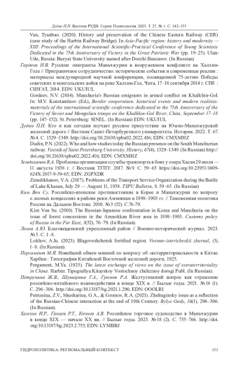 37. Sun, Y. (2024). The Shanghai agency of Ussuri Railway and establishment of direct mixed railway-water communication between Shanghai and Manchuria (1923-1926). Far Eastern Studies, 5, 156-170. ;. DOI: 10.31857/S0131281224050113 EDN: RTOGXH
