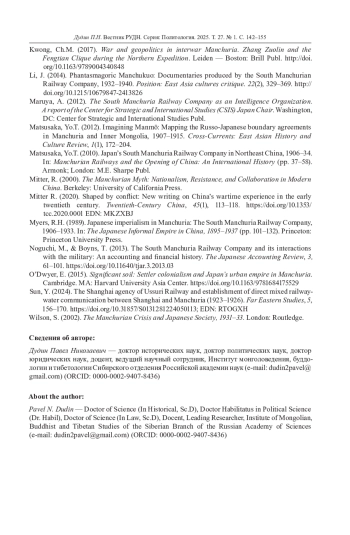 5. Дудин П.Н. Кто и как сегодня изучает русское присутствие на Южно-Маньчжурской железной дороге // Вестник Санкт-Петербургского университета. История. 2022. Т. 67. № 4. С. 1329-1349. ;. DOI: 10.21638/spbu02.2022.416 EDN: CMXMHZ