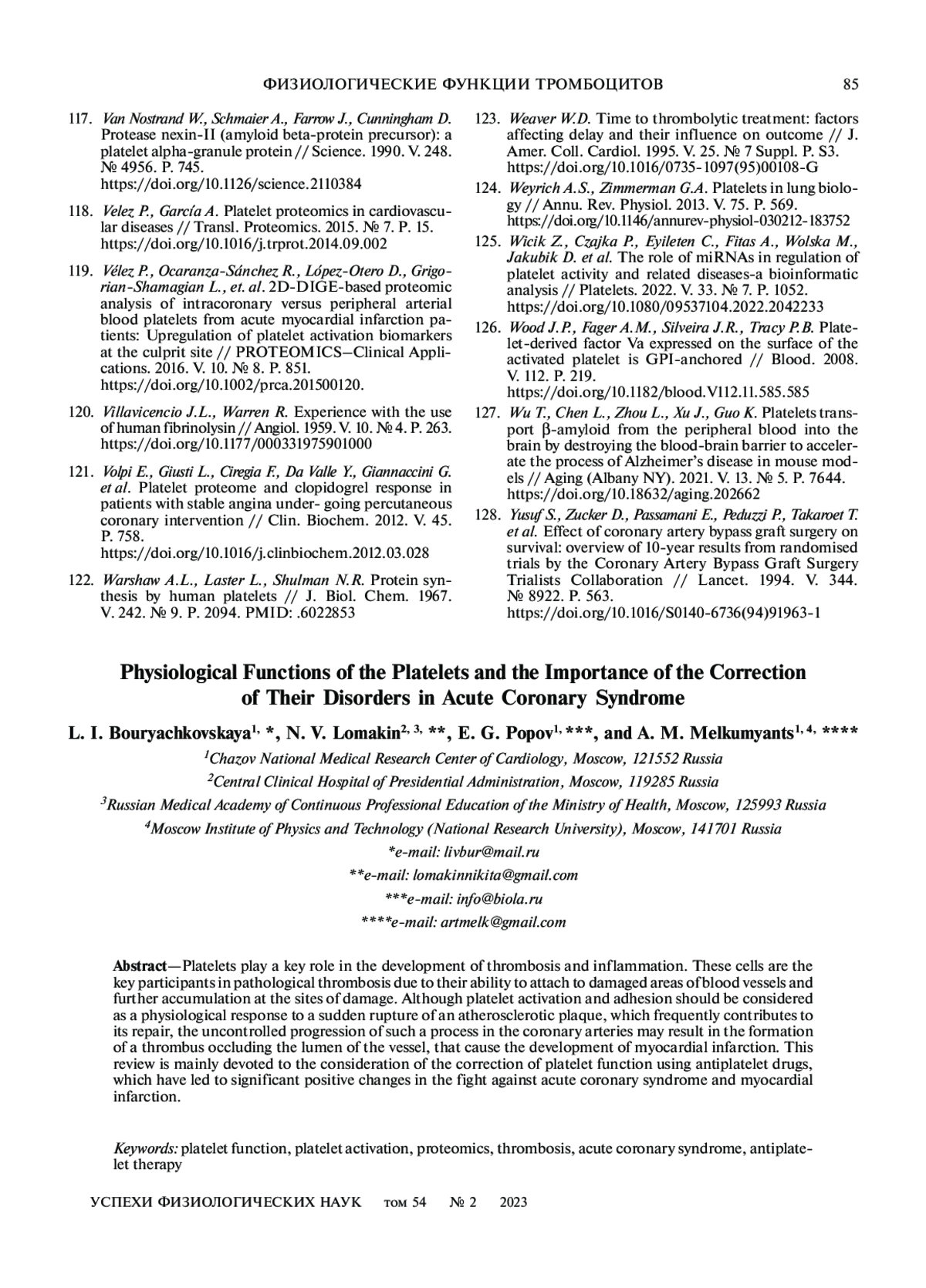 118. Velez P., García A. Platelet proteomics in cardiovascular diseases // Transl. Proteomics. 2015. № 7. P. 15. DOI: 10.1016/j.trprot.2014.09.002 EDN: YVBZAP