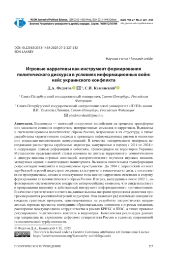 Видеоигры - значимый инструмент воздействия на процессы трансформации массового сознания посредством интерактивных символов и нарративов. Выявлены и систематизированы политические образы России, встроенные в их структуру, а также разработаны стратегические подходы к превенции информационных рисков и оптимизации социально-политических коммуникаций. В качестве эмпирического материала исследования рассмотрены зарубежные видеоигры, выпущенные в период с 2014 по 2024 г. и содержащие прямые референции к событиям, происходящим на территории Украины. Методология представленной статьи основана на синтезе нарративного, семиотического и дискурс-анализа игровых аннотаций, алгоритмического изучения игровых механик, экспертных оценок и лонгитюдного мониторинга. Выявлена значительная трансформация репрезентации конфликта в видеоигровом пространстве. До 2014 г. украинский сегмент зарубежной игровой индустрии сохранял культурную и тематическую связь с постсоветским пространством, однако в последующие годы вектор нарративов сместился в сторону формирования антагонистического образа России. В играх, выпущенных после 2022 г., зафиксировано систематическое внедрение антироссийских символов, что свидетельствует о превращении видеоигр в действенный инструмент информационного противостояния. В качестве стратегического ответа на данные вызовы авторами предложена целостная программа развития российской игровой индустрии. Она включает ряд ключевых инициатив: создание грантовых программ, ориентированных на разработку патриотически направленных игровых проектов; интеграцию образовательных элементов в игровые механики; расширение международного сотрудничества в рамках БРИКС и ШОС, а также правовое регулирование политического контента в видеоиграх. Комплексная реализация данных мер направлена на укрепление цифрового суверенитета России в условиях современной геополитической турбулентности.