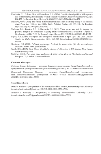 7. Каминский С.И., Федотов Д.А., Кривошеев А.А. Геймификация политики: видеоигры как инструмент формирования дискурса и контрдискурса в конфликте // Социально-политические науки. 2024. Т. 14, № 6. С. 164-173. DOI: 10.33693/2223-0092-2024-14-6-164-173 EDN: EREGIA