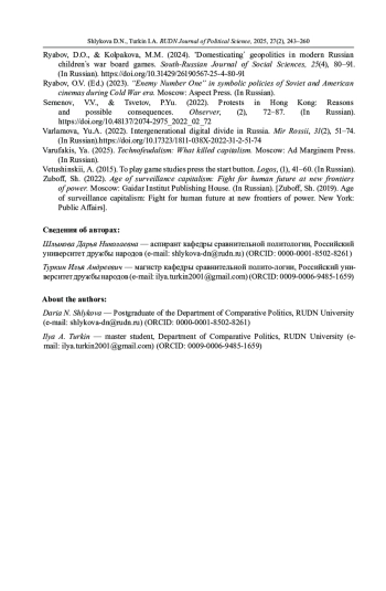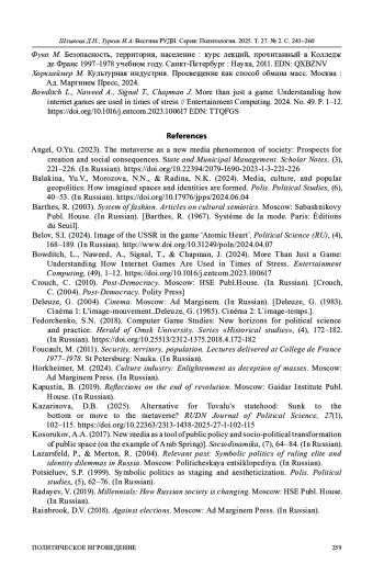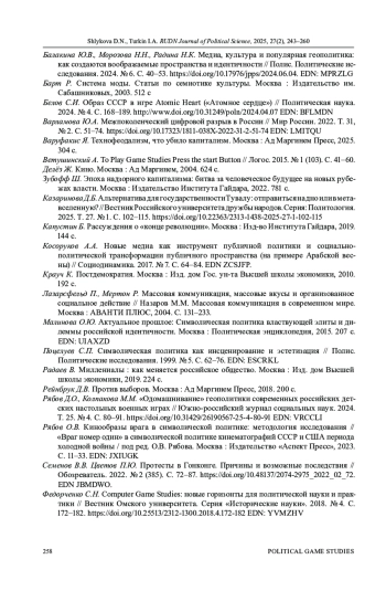3. Балакина Ю.В., Морозова Н.Н., Радина Н.К. Медиа, культура и популярная геополитика: как создаются воображаемые пространства и идентичности // Полис. Политические исследования. 2024. № 6. С. 40-53. DOI: 10.17976/jpps/2024.06.04 EDN: MPRZLG