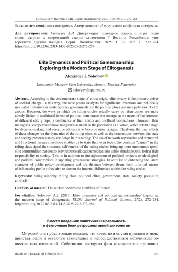 Современная стадия элитогенеза утверждает ведущую роль внутри элитарного соперничества в качестве источника общественных трансформаций. В этом смысле маневры и политические игры элитарных группировок являются наиболее мощными триггерами масштабных инноваций и политически целесообразных проектов в современных государствах. При этом актуальные формы осуществления правящими кругами своего функционала связаны не столько с институциональными, сколько с коалиционными формами политического доминирования, складывающимися на пересечении интересов различных элитарных групп, сочетания их статусных и неформальных связей. При этом неизменным остается преимущественный рост их управленческих компетенций по сравнению с населением, что создает предпосылки для усиления непрозрачности действий по принятию решений и распределению ресурсов. В этом контексте возникает исследовательская задача, предполагающая выяснение актуальных последствий этих тенденций, причем как для динамики самого правящего слоя, так и отношений государства и общества. Использование сетевых подходов и структурно-функциональных методов исследования позволяет констатировать, что уже сегодня коалиционные «игры» в правящем классе демонстрируют не только корректировку политических проектов или идейно-политические компромиссы при обновлении государственных стратегий, но и сигнализируют о структурном самообновлении правящих кругов, выводящих на историческую арену более автономные (пост)элитарные сообщества, контролирующие ключевые механизмы распределения ресурсов, но при этом утрачивающие ответственность перед обществом. Используемые ими неформальные методы влияния на цели государственной политики усиливают внутренние размежевания правящих кругов, одновременно повышая латентный характер разработки государственной политики и увеличивая дистанцию между государством и обществом.