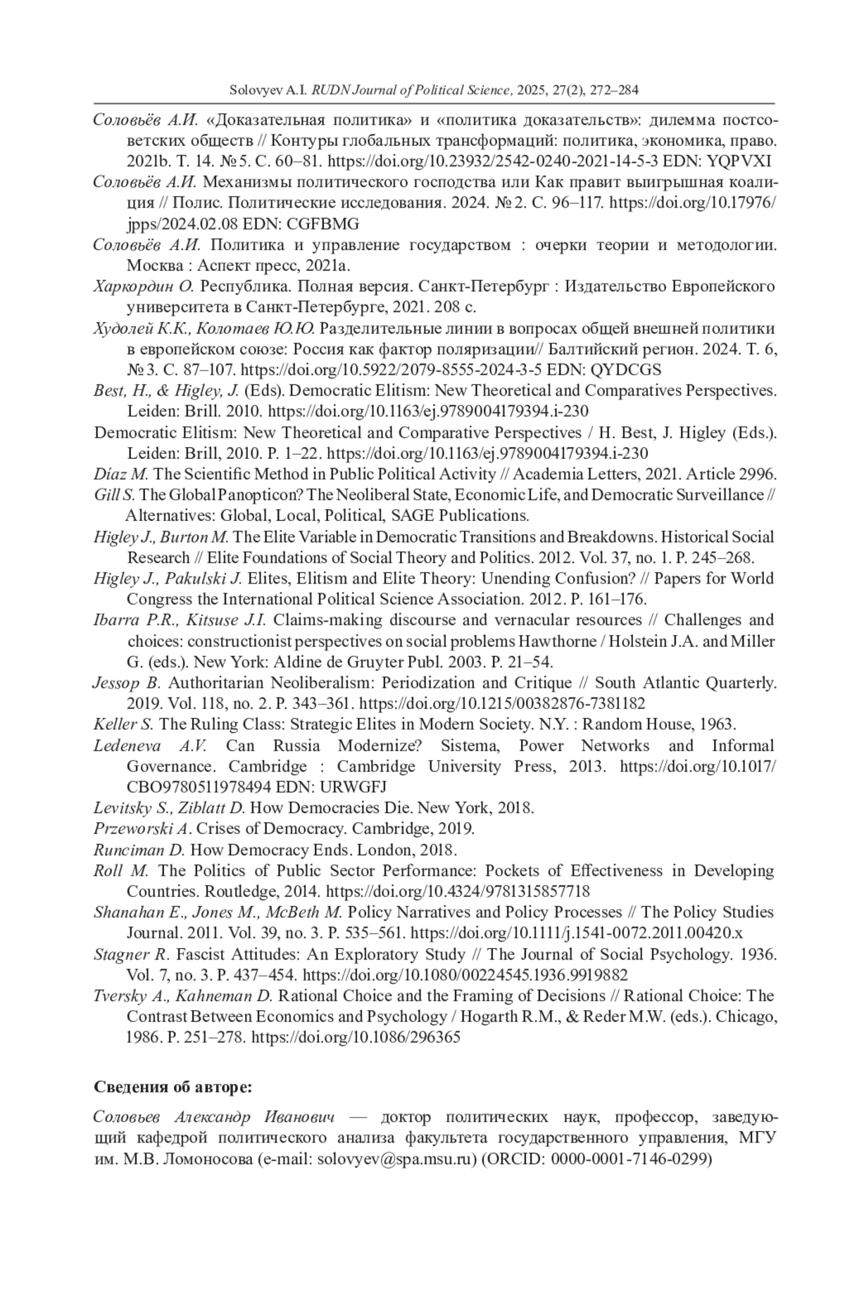 9. Соловьёв А.И. “Доказательная политика” и “политика доказательств”: дилемма постсоветских обществ // Контуры глобальных трансформаций: политика, экономика, право. 2021b. Т. 14. № 5. С. 60-81. DOI: 10.23932/2542-0240-2021-14-5-3 EDN: YQPVXI
