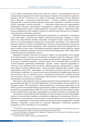 Металлургическая промышленность Российской Федерации имеет особую значимость для экономики государства. Ее прямой вклад в ВВП составляет до 5 %, в добавленную стоимость обрабатывающей промышленности – 17,4 %, в экспорт – 10 % 1. Продукция металлургов критически необходима для других отраслей экономики страны: машиностроения, транспортной отрасли, нефтегазовой промышленности, строительства и др. В сфере металлургии занято около 500 тыс. человек1. Актуализируется роль металлургических предприятий в свете пересмотра социальной ответственности крупного бизнеса в России. В частности, это следует из Послания Президента России Федеральному Собранию: «… Крупный российский бизнес… отвечает за работу стратегических предприятий, за многотысячные трудовые коллективы, определяет социально-экономическую ситуацию во многих регионах. <…> Запускайте новые проекты, зарабатывайте, вкладывайте в Россию, инвестируйте в предприятия и рабочие места, помогайте школам и университетам, науке и здравоохранению, культуре и спорту» 2. Пересмотр такого вклада предприятий целесообразен в рамках их комплексной деятельности по применению принципов устойчивого развития.