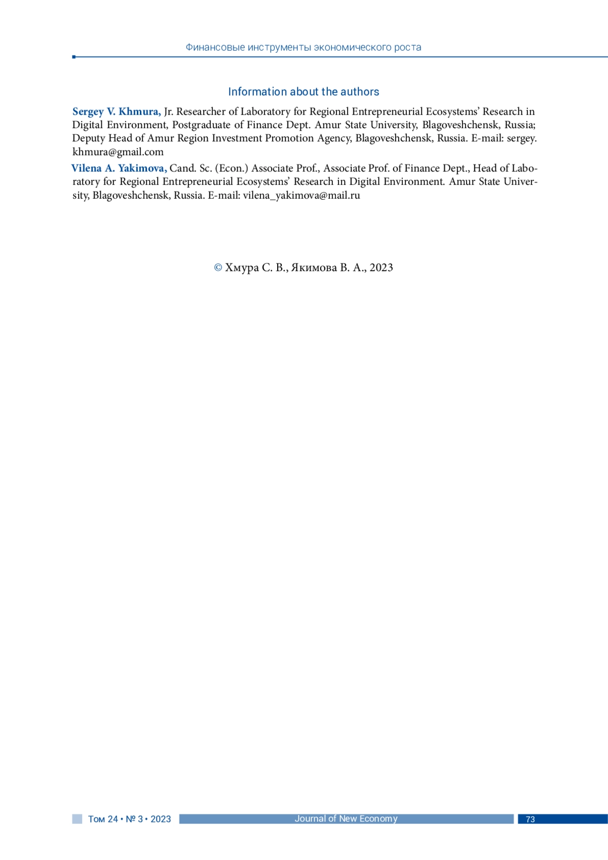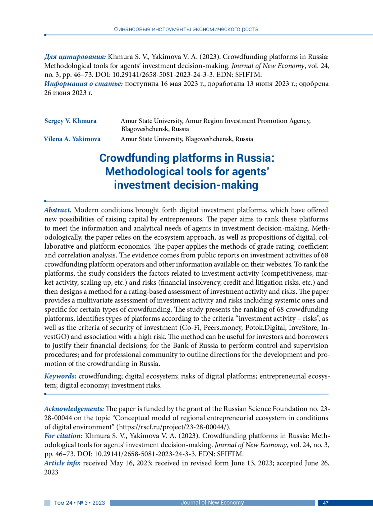 ХМУРА С. В., ЯКИМОВА В. А. КРАУДФАНДИНГОВЫЕ ПЛАТФОРМЫ В РФ: МЕТОДИЧЕСКИЙ ИНСТРУМЕНТАРИЙ ДЛЯ ПРИНЯТИЯ АГЕНТАМИ ИНВЕСТИЦИОННЫХ РЕШЕНИЙ // JOURNAL OF NEW ECONOMY. 2023. Т. 24 № 3