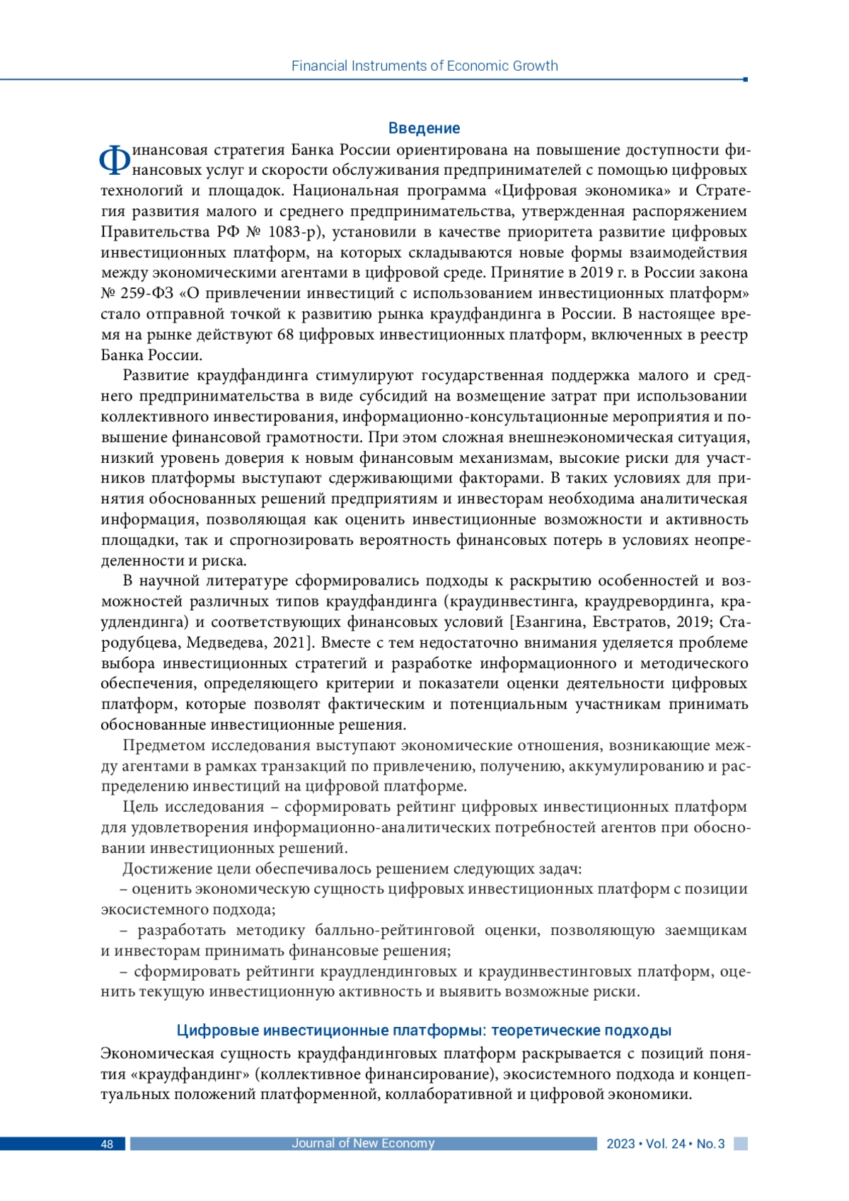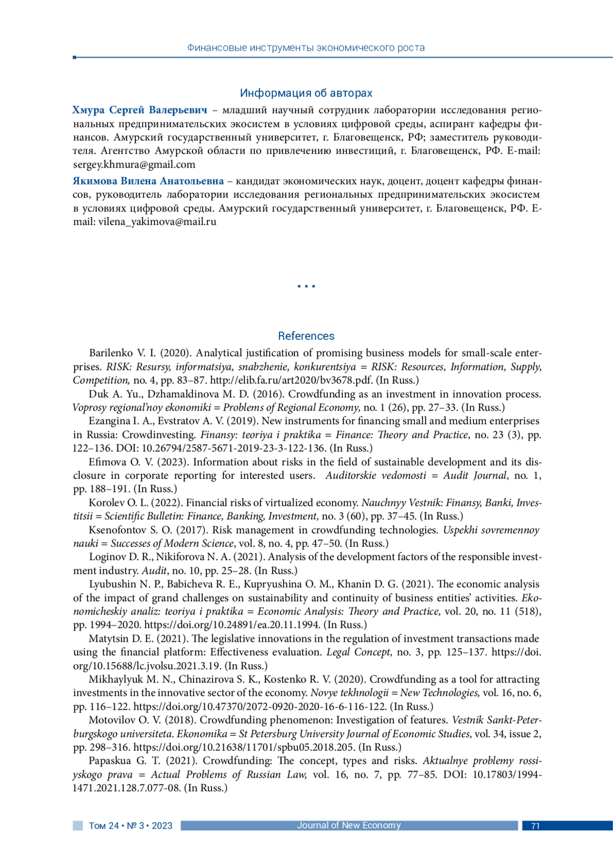 Статья: КРАУДФАНДИНГОВЫЕ ПЛАТФОРМЫ В РФ: МЕТОДИЧЕСКИЙ ИНСТРУМЕНТАРИЙ ДЛЯ ПРИНЯТИЯ АГЕНТАМИ ИНВЕСТИЦИОННЫХ РЕШЕНИЙ (2023)