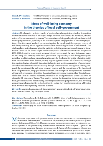 Преимущественно центр-периферийная модель развития территорий, длительное доминирование трансфертов в структуре доходов муниципальных бюджетов сформировали затяжной, хронический характер социально-экономических проблем. Это обуславливает необходимость пересмотра целей, принципов и содержания муниципального управления, особенно в сфере экономики. Статья направлена на ревизию положений теорий местного самоуправления в контексте развивающейся концепции экономики благополучия, которые составили методологическую базу работы. Использовался комплекс общенаучных методов, включая ретроспективный анализ и систематизацию. Проведен обзор дореволюционных работ российских ученых и публицистов за период 1870–1917 гг., посвященных земскому и городскому самоуправлению. Выявлен образ благополучия территории местного самоуправления, заключающийся в обеспечении наружного и внутреннего благоустройства территории; попечении о продовольственной обеспеченности, здоровье, образовании, безопасности от различных угроз (пожаров, болезней, преступности); организации экономической жизни территории через муниципализацию общественно значимых производств и услуг, трудоустройство безработных, а также стимулирование экономической деятельности посредством кооперации и выдачи кредитов. На основе сопоставления нарративов концепции экономики благополучия и положений теорий местного самоуправления показано, что эта концепция может быть реализована средствами местного самоуправления, так как их теоретическая база соответствует друг другу. Сделан вывод о необходимости реализации потенциала системы местного самоуправления, заложенного Александром II. Для этого требуется увеличить тесноту взаимодействия жителей и органов управления, распространить знания о муниципальном управлении, предоставить большие финансовые возможности местным властям для концентрации на решении локальных проблем и выражении интересов местного населения