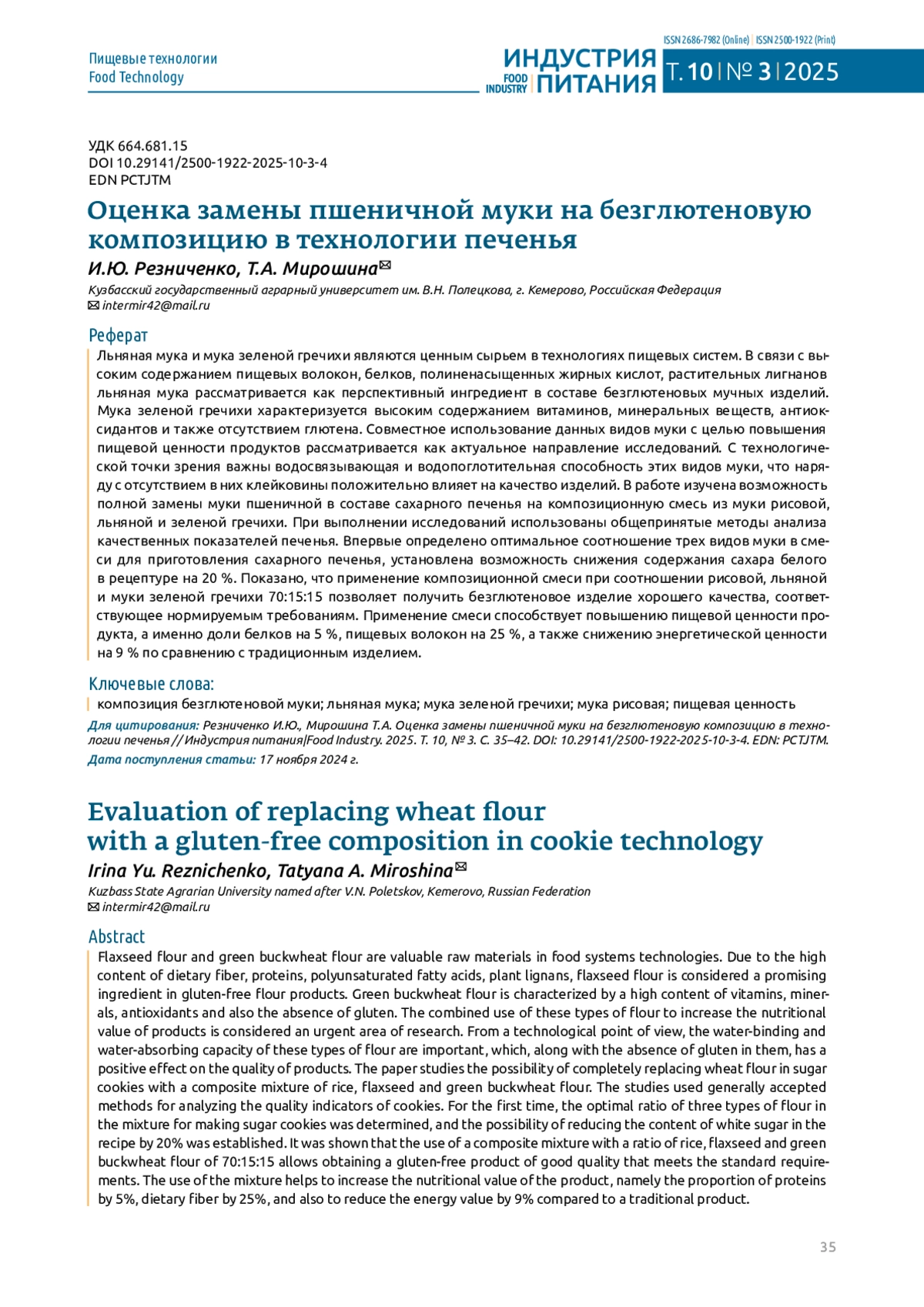 25. Резниченко И.Ю., Бородулин Д.М., Пикулина Н.С. Разработка рецептуры и оценка качества безглютенового мучного изделия // Ползуновский вестник. 2020. № 2. С. 82-86. 10.25712/ASTU.2072-8921.2020.02.016. DOI: 10.25712/ASTU.2072-8921.2020.02.016.EDN EDN: HBNCQV
