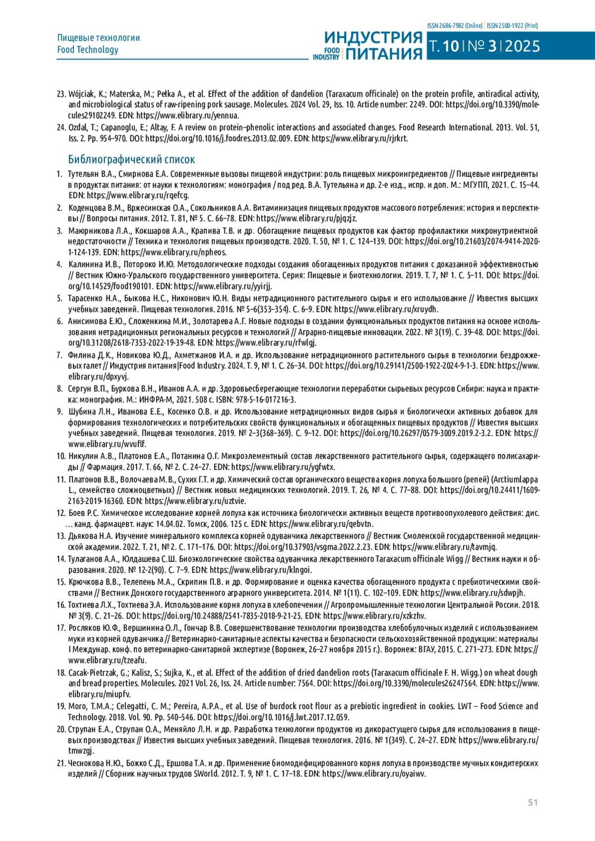21. Chesnokova, N.Yu.; Bozhko, S.D.; Yershova, T.A. i dr. Primeneniye biomodifitsirovannogo kornya lopukha v proizvodstve muchnykh konditerskikh izdeliy [Use of biomodified burdock root in the production of flour confectionery products]. Sbornik nauchnykh trudov SWorld. 2012. Vol. 9, No. 1. Pp. 17-18. (in Russ.). EDN: OYAIWV
