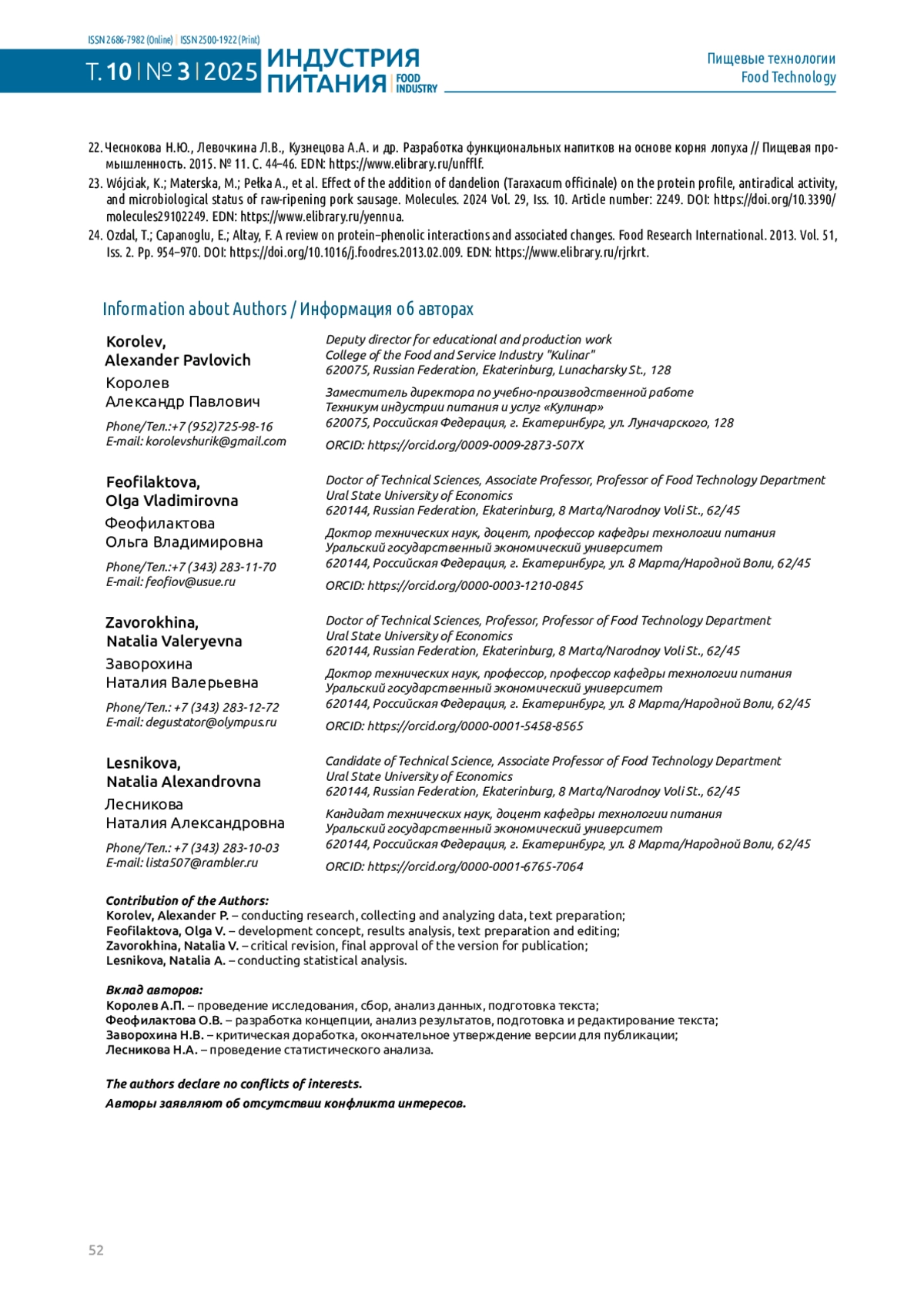 22. Chesnokova, N.Yu.; Levochkina, L.V.; Kuznetsova, A.A. i dr. Razrabotka funktsional’nykh napitkov na osnove kornya lopukha [Development of functional drinks based on burdock root]. Pishchevaya promyshlennost’. 2015. No. 11. Pp. 44-46. (in Russ.). EDN: UNFFLF