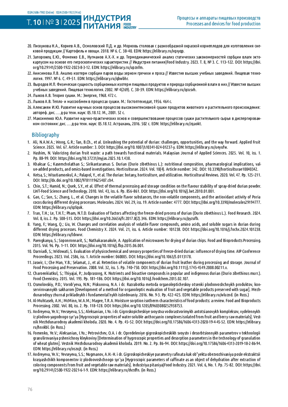 ВО Ч. К., НУГМАНОВ А. Х., АЛЕКСАНЯН И. Ю., ОСМОЛОВСКИЙ П. Д., АЙСУНГУРОВ Н. Д., ФОМЕНКО Е. В. ЭМПИРИЧЕСКОЕ ИЗУЧЕНИЕ ГИГРОСКОПИЧЕСКИХ ПАРАМЕТРОВ ЛОМТИКОВ ПЛОДОВ ДУРИАНА // ИНДУСТРИЯ ПИТАНИЯ. 2025. Т. 10 № 3