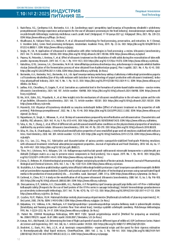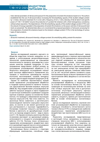 Статья: ИСПОЛЬЗОВАНИЕ УЛЬТРАЗВУКОВОЙ ОБРАБОТКИ ДЛЯ ПРИГОТОВЛЕНИЯ БЕЛКОВО-ЖИРОВЫХ ЭМУЛЬСИЙ НА ОСНОВЕ ГОВЯЖЬЕГО КОЛЛАГЕНОВОГО БЕЛКА (2025)