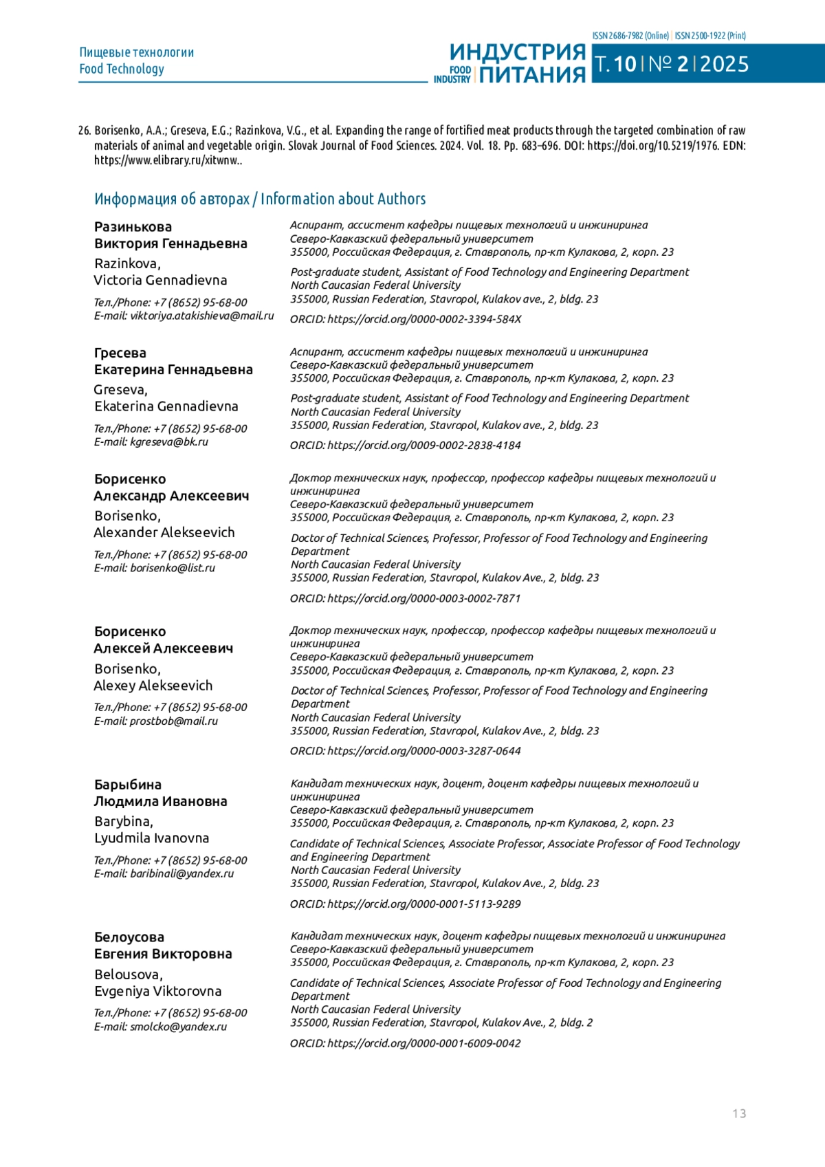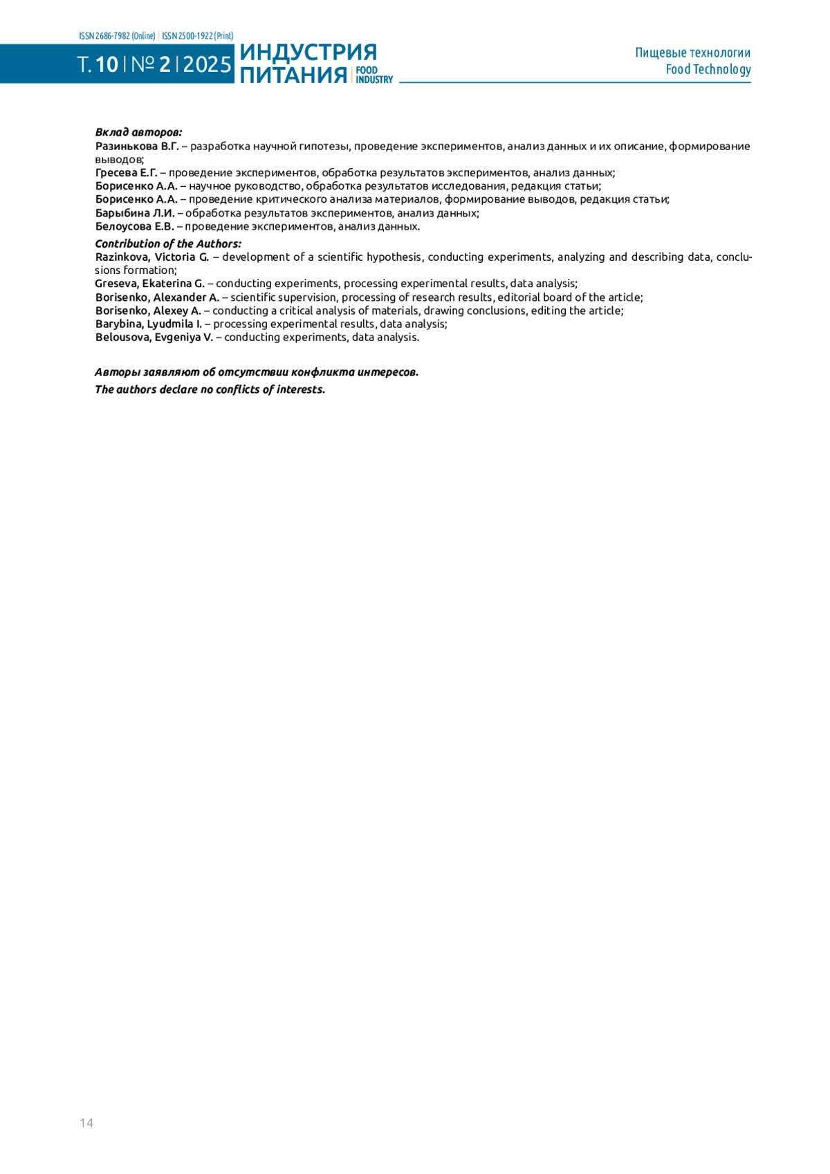 АТАКИШИЕВА В. Г., ГРЕСЕВА Е. Г., БОРИСЕНКО А. А., БАРЫБИНА Л. И., БЕЛОУСОВА Е. В. ИСПОЛЬЗОВАНИЕ УЛЬТРАЗВУКОВОЙ ОБРАБОТКИ ДЛЯ ПРИГОТОВЛЕНИЯ БЕЛКОВО-ЖИРОВЫХ ЭМУЛЬСИЙ НА ОСНОВЕ ГОВЯЖЬЕГО КОЛЛАГЕНОВОГО БЕЛКА // ИНДУСТРИЯ ПИТАНИЯ. 2025. Т. 10 № 2
