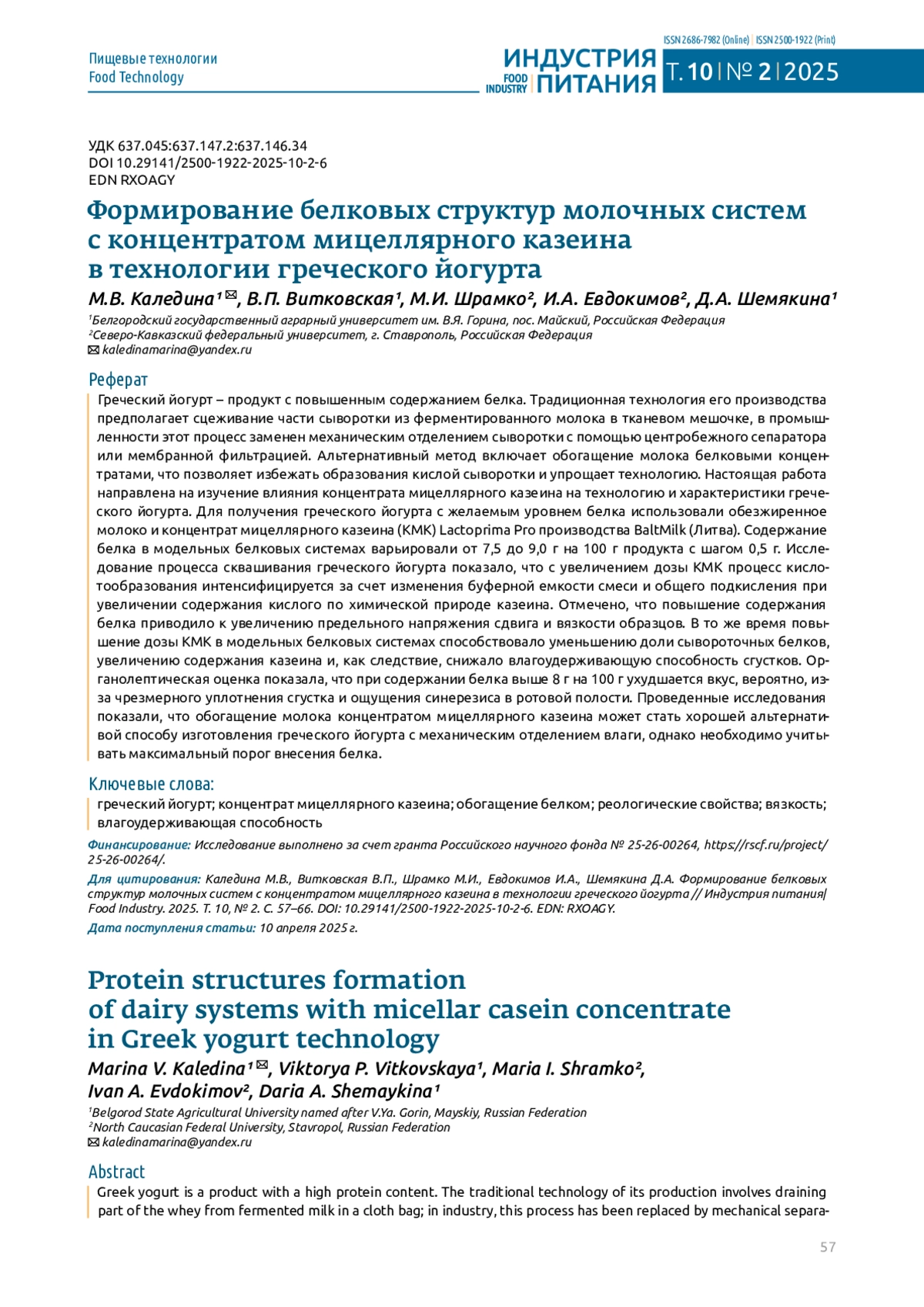 4. Shipulin, V.I.; Dzhangiryan, N.A. Properties of micellar casein and application in food industry. Modern Science and Innovations. 2023. Vol. 1. Pp. 56-64. 10.37493/2307-910X.2023.1.5. DOI: 10.37493/2307-910X.2023.1.5.EDN EDN: PQMCOE