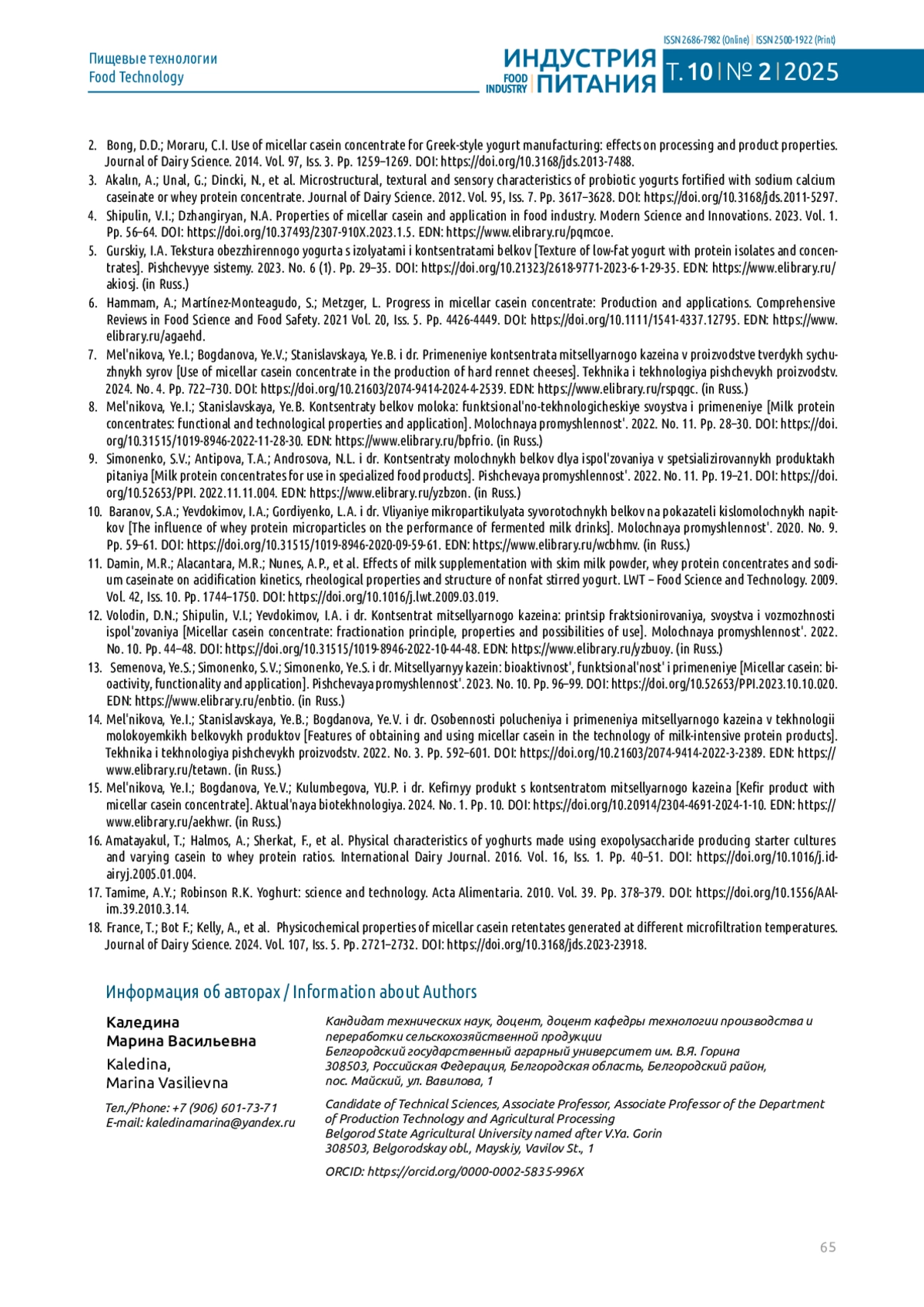 12. Володин Д.Н., Шипулин В.И., Евдокимов И.А. и др. Концентрат мицеллярного казеина: принцип фракционирования, свойства и возможности использования // Молочная промышленность. 2022. № 10. С. 44-48. 10.31515/1019-8946-2022-10-44-48. DOI: 10.31515/1019-8946-2022-10-44-48.EDN EDN: YZBUOY